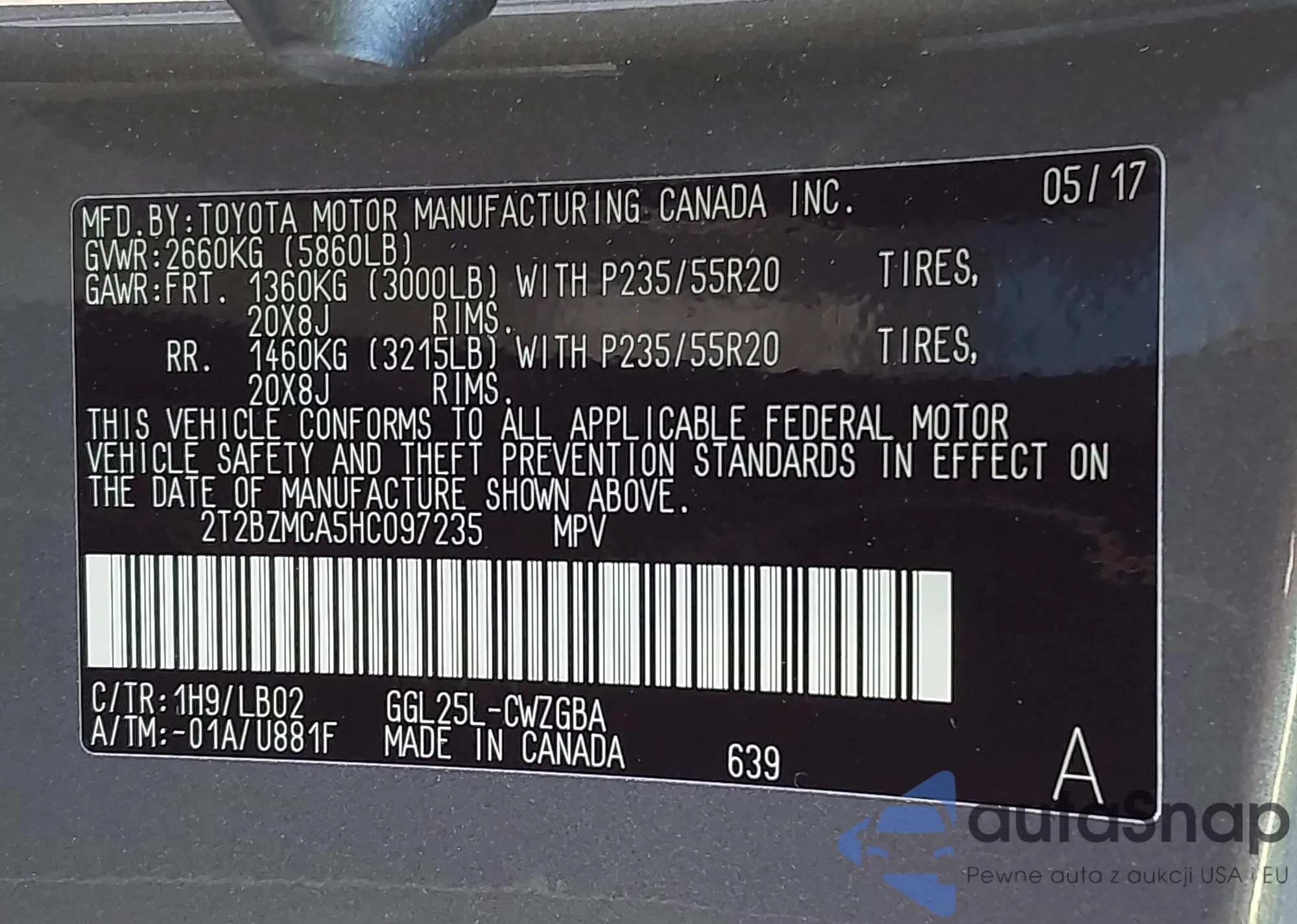 • VIN 2T2BZMCA5HC097235