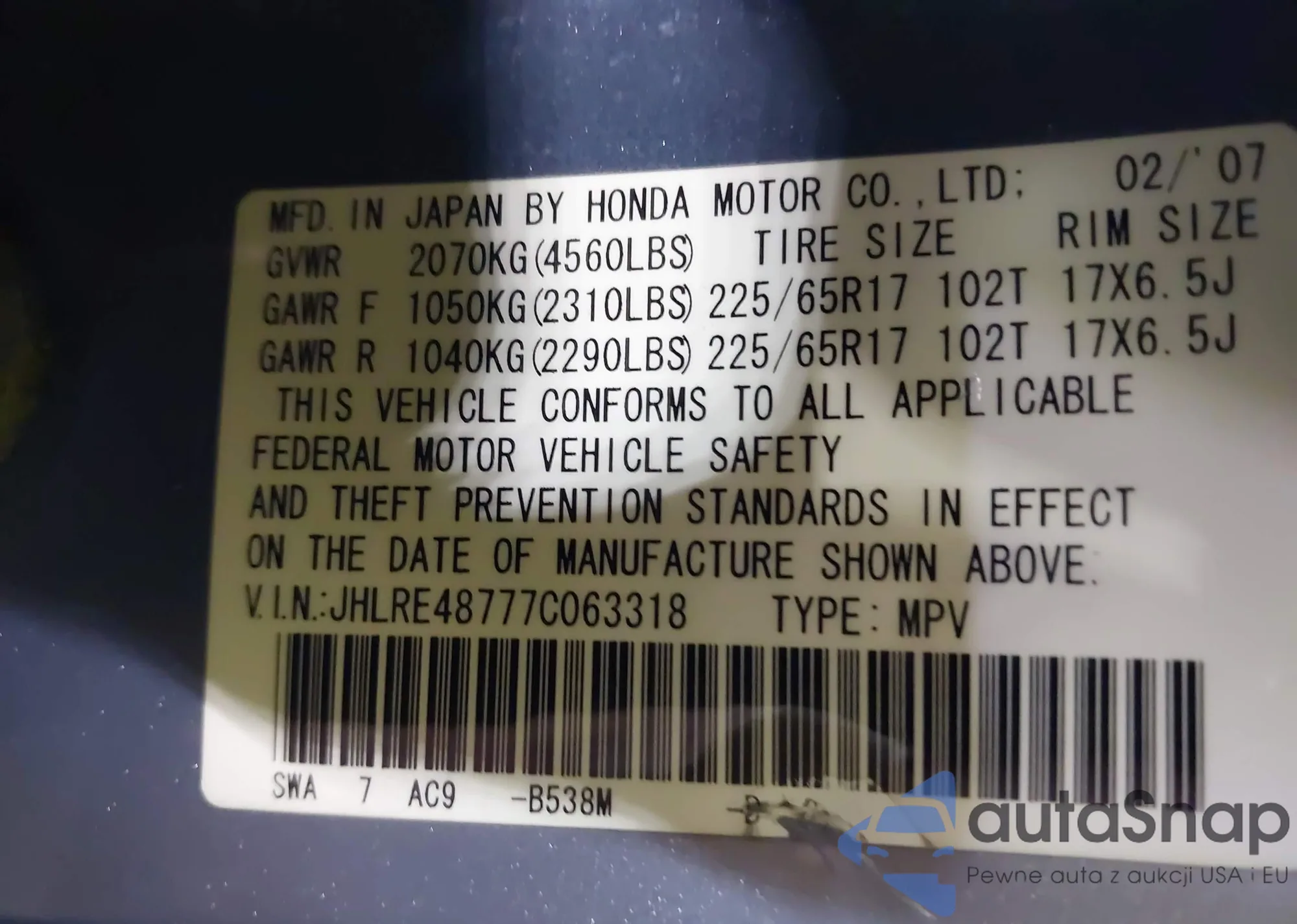 LOT: 43075042 VIN: JHLRE48777C063318