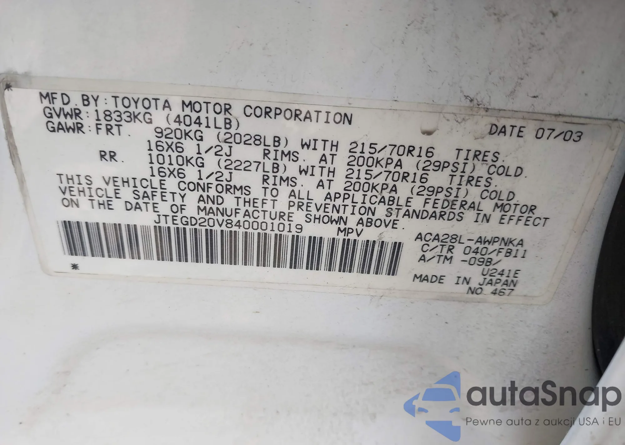 LOT: 43095927 VIN: JTEGD20V840001019