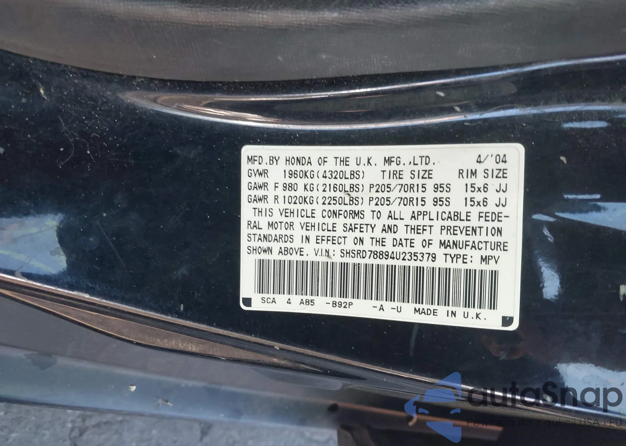 • VIN SHSRD78894U235379