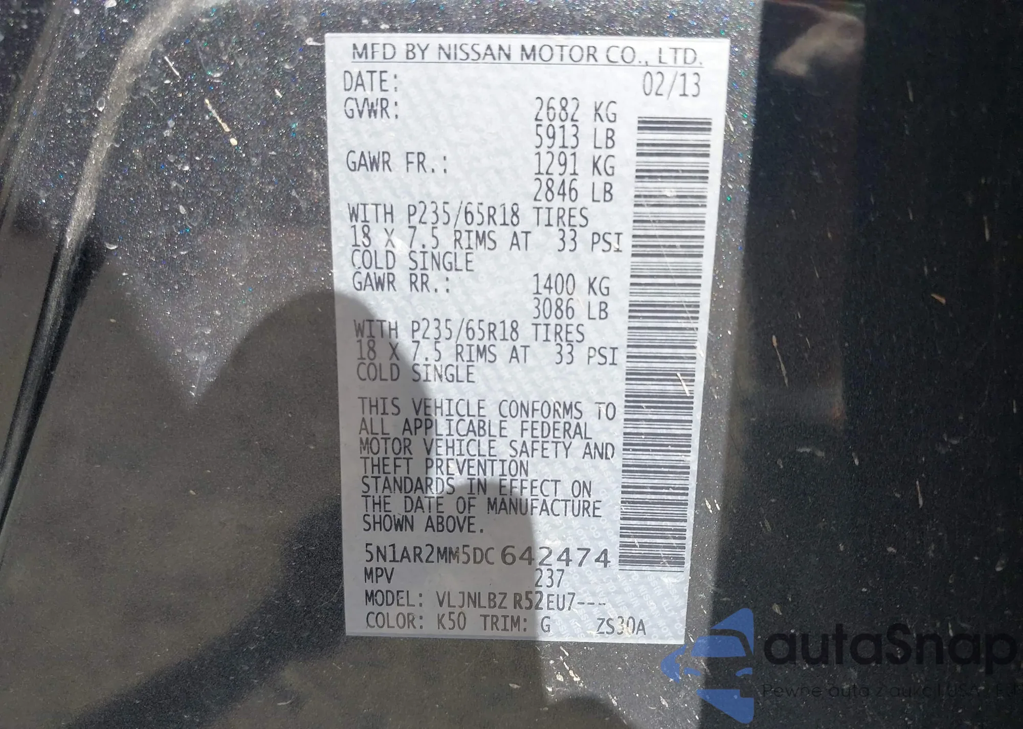 LOT: 43117399 VIN: 5N1AR2MM5DC642474