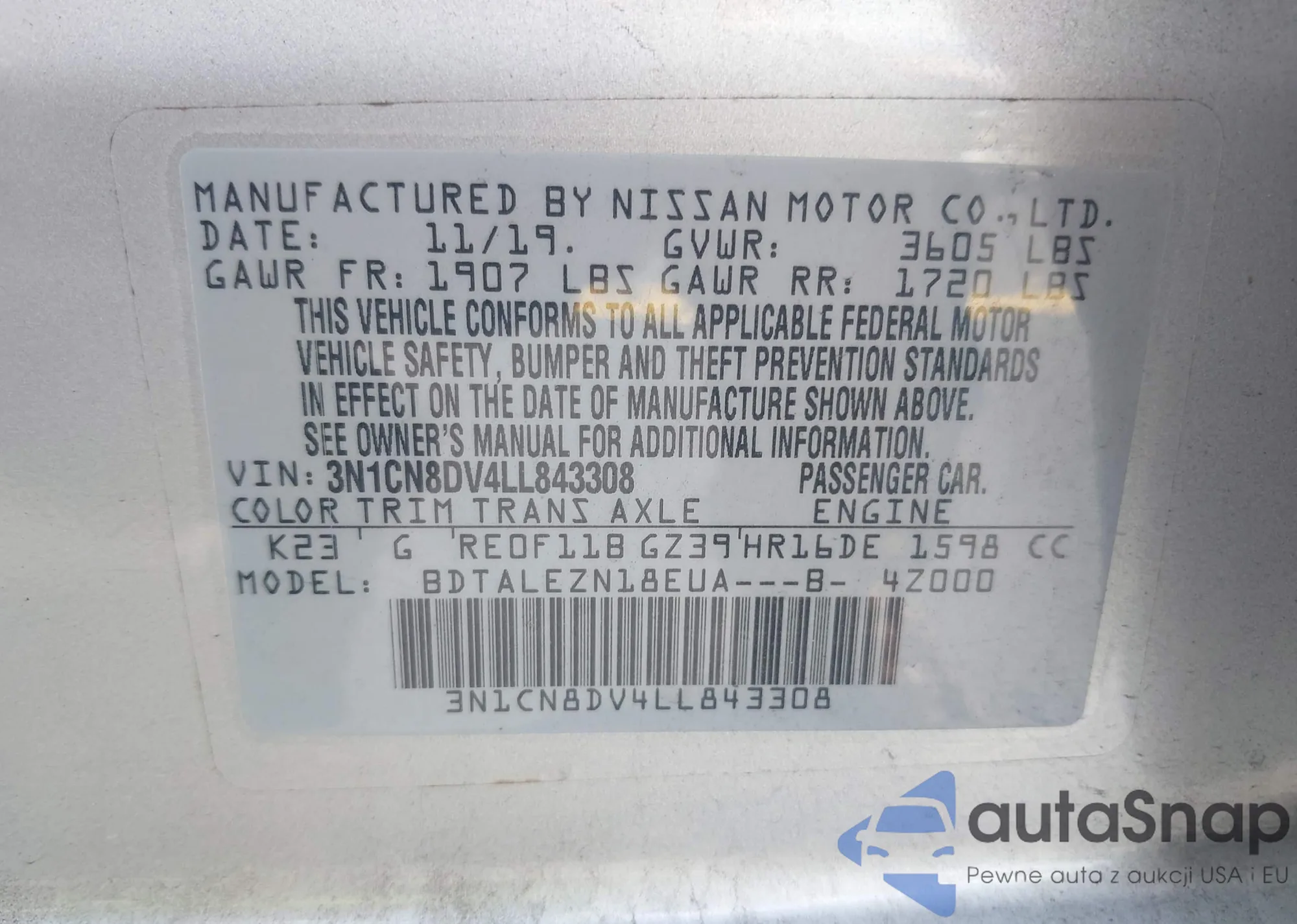 • VIN 3N1CN8DV4LL843308