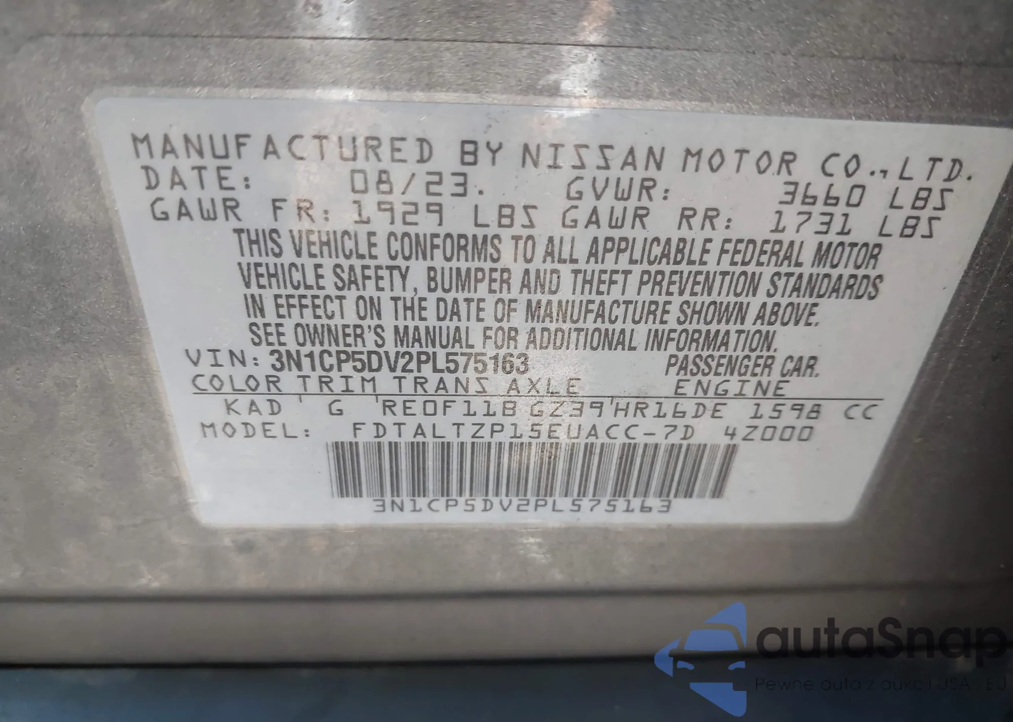 • VIN 3N1CP5DV2PL575163