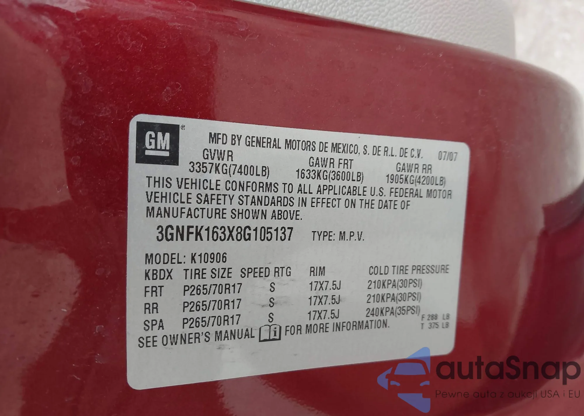 • VIN 3GNFK163X8G105137