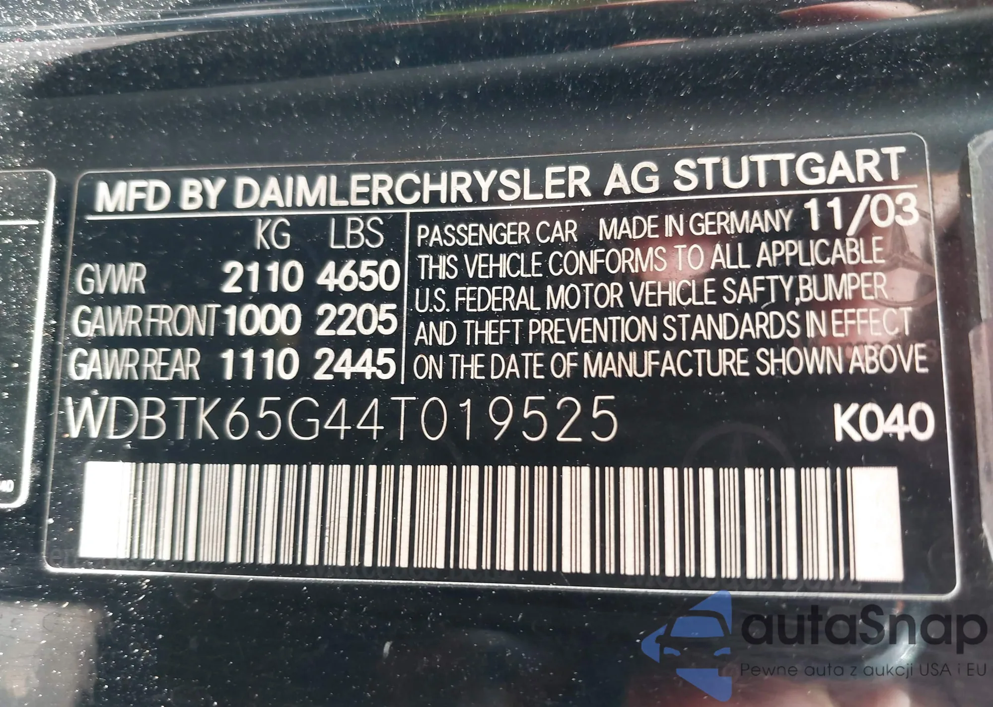 LOT: 42992828 VIN: WDBTK65G44T019525