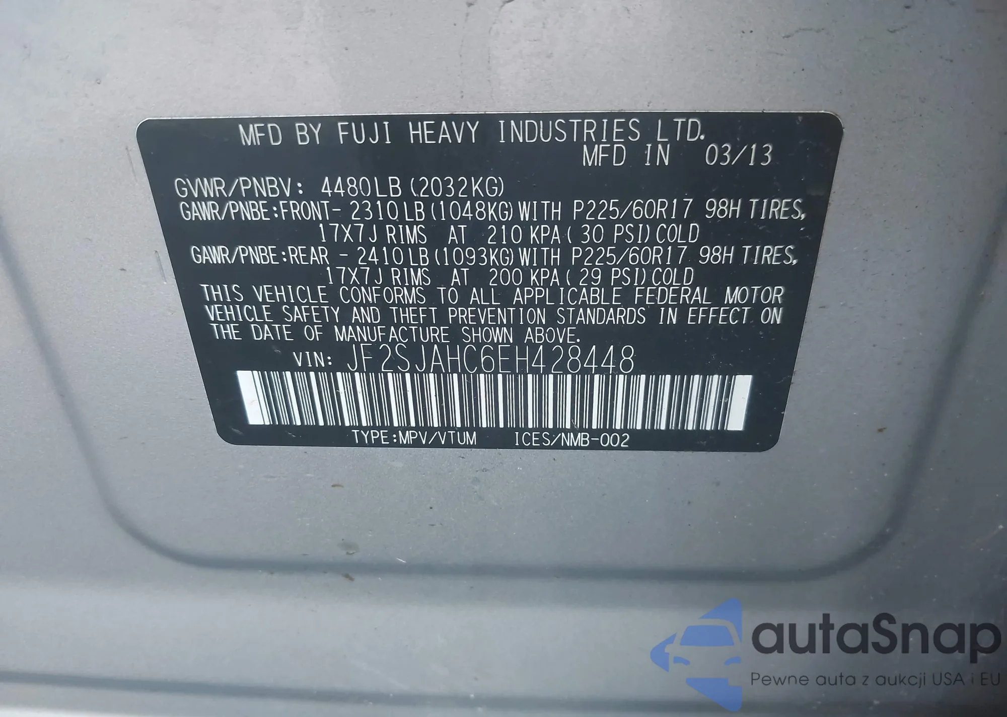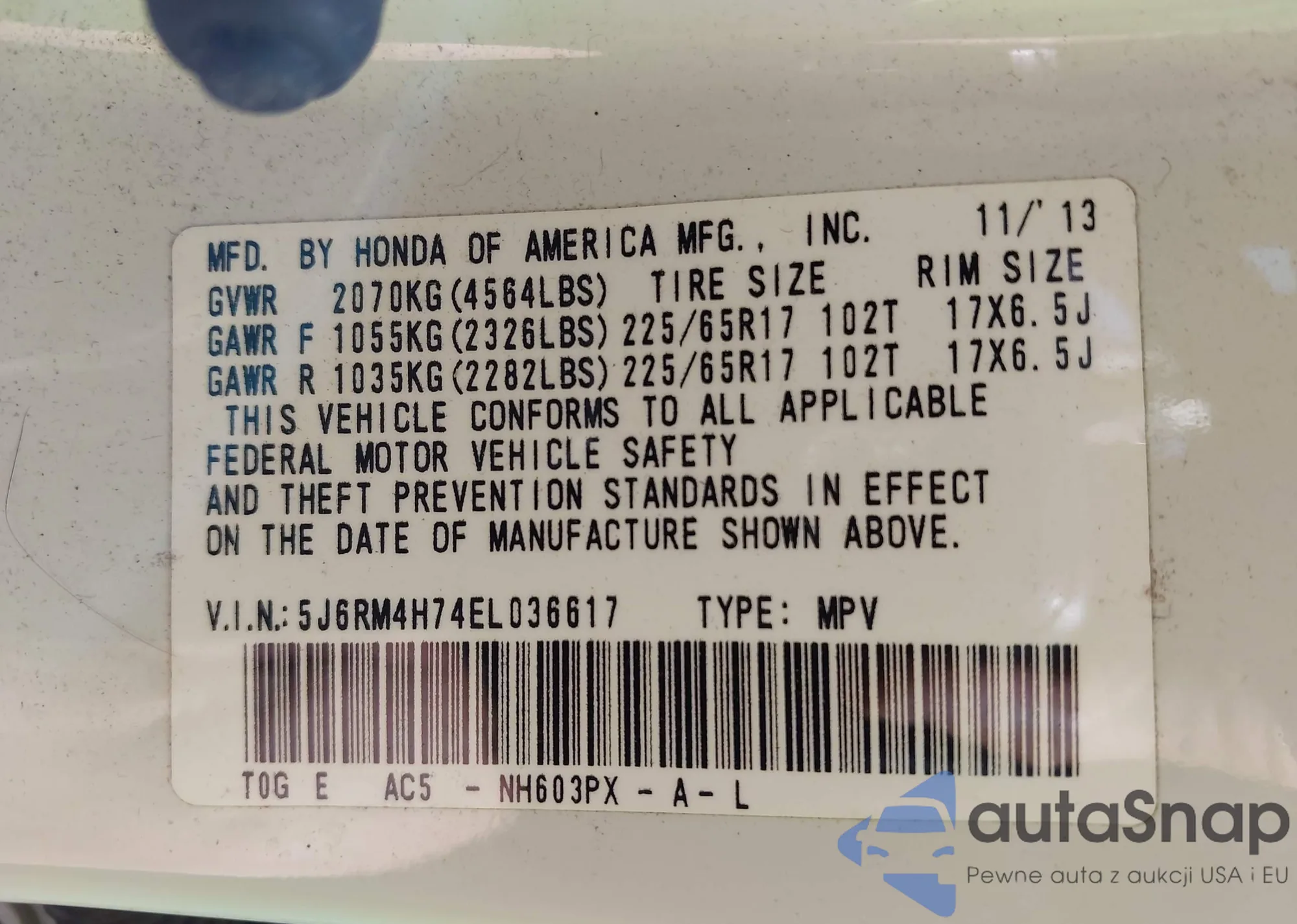 • VIN 5J6RM4H74EL036617