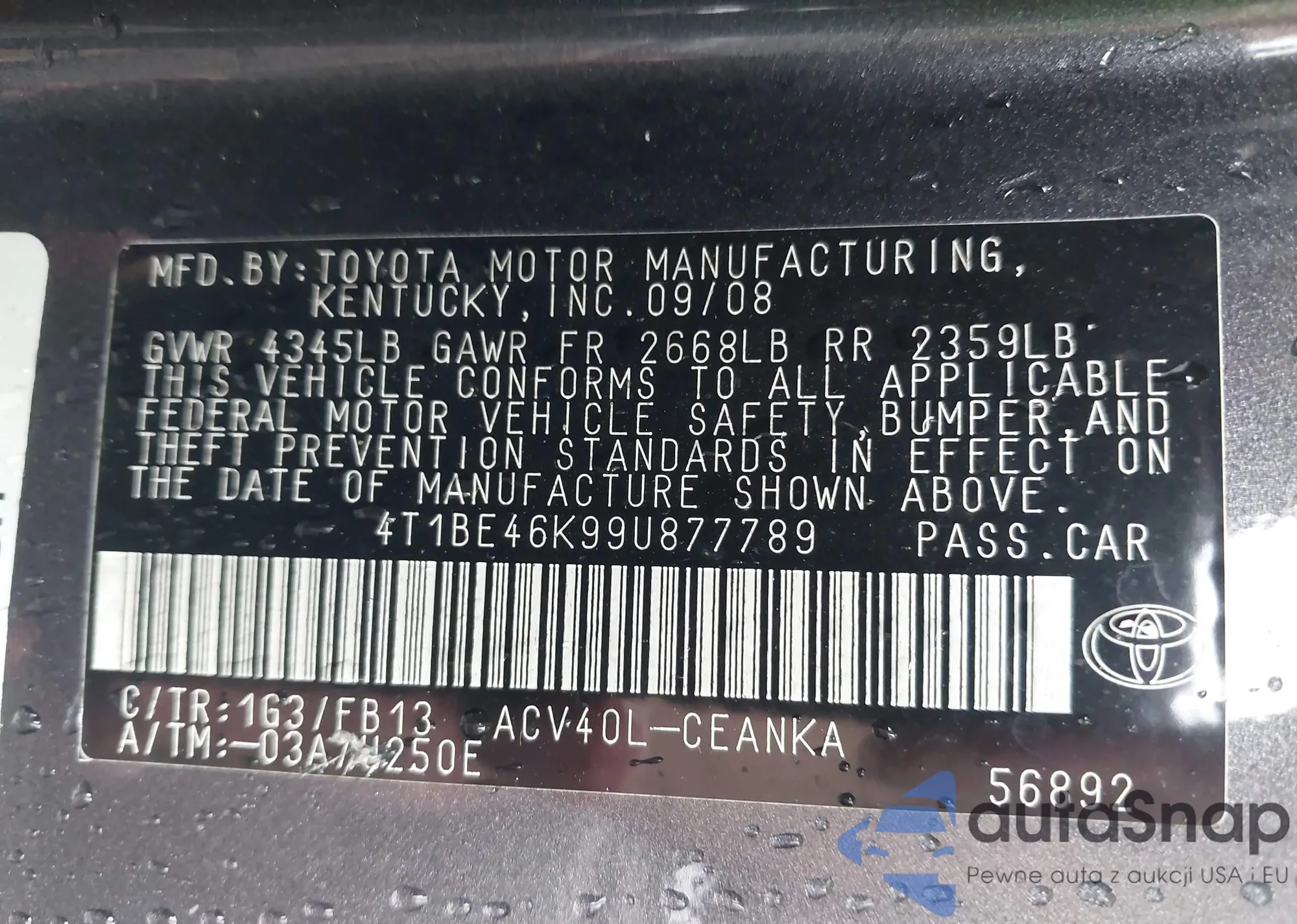 LOT: 43180958 VIN: 4T1BE46K99U877789