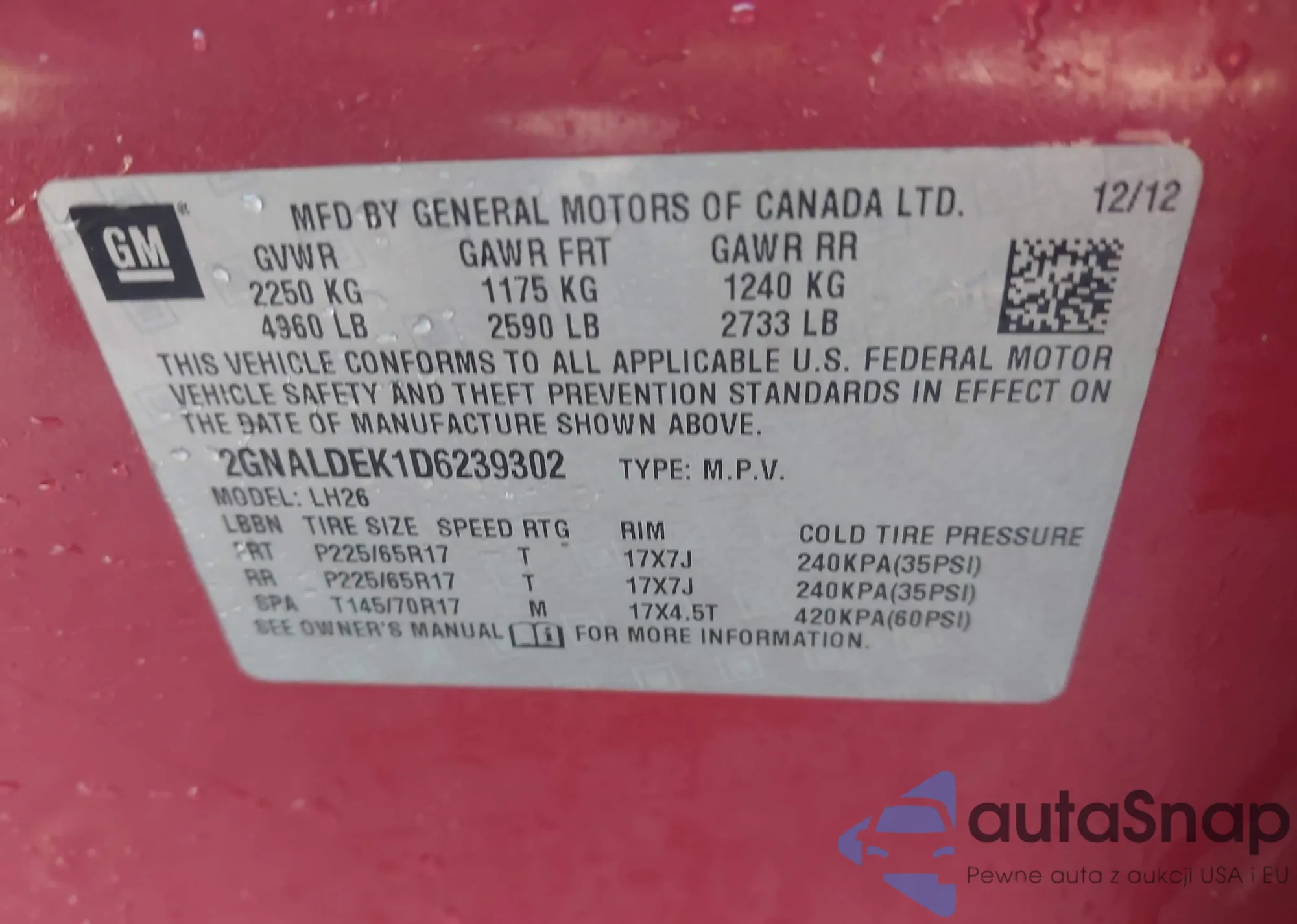 LOT: 43173905 VIN: 2GNALDEK1D6239302