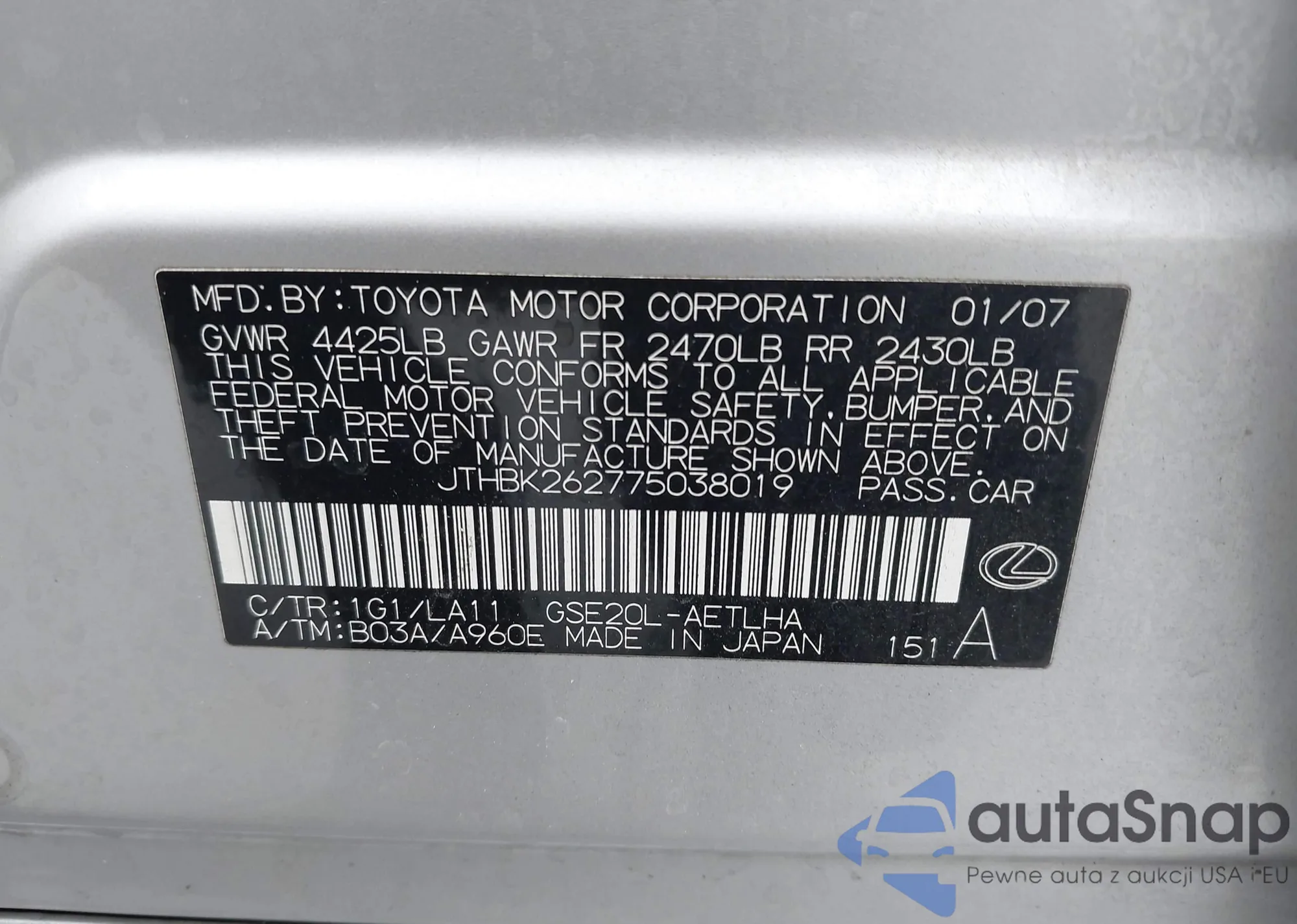 LOT: 43183217 VIN: JTHBK262775038019