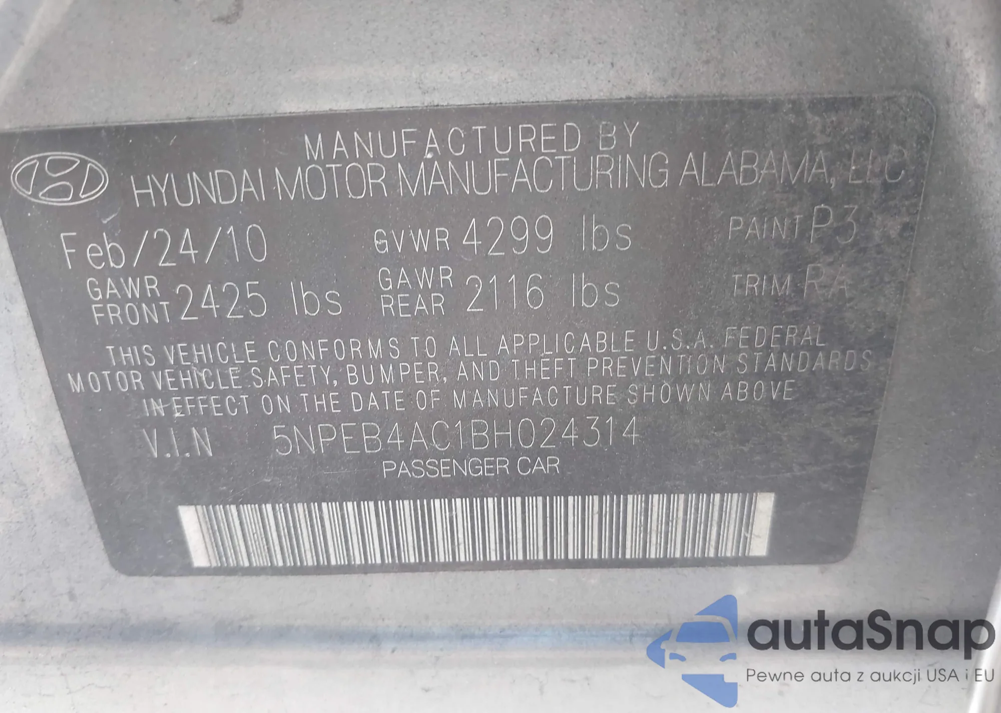 • VIN 5NPEB4AC1BH024314