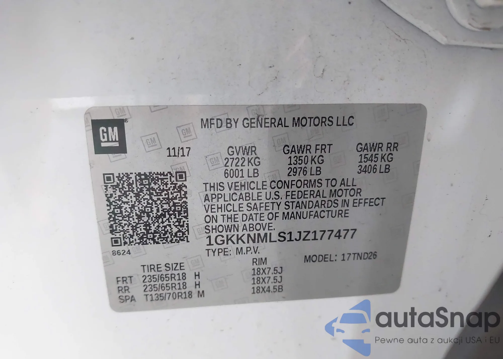 LOT: 43255033 VIN: 1GKKNMLS1JZ177477