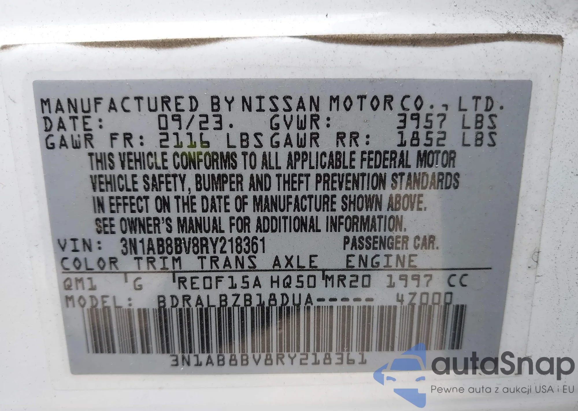 • VIN 3N1AB8BV8RY218361