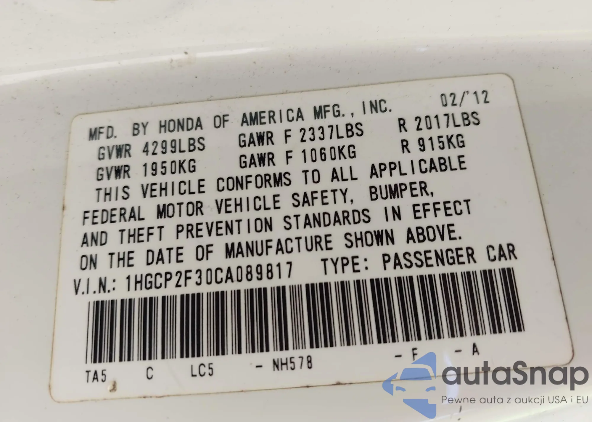 LOT: 42140557 VIN: 1HGCP2F30CA089817
