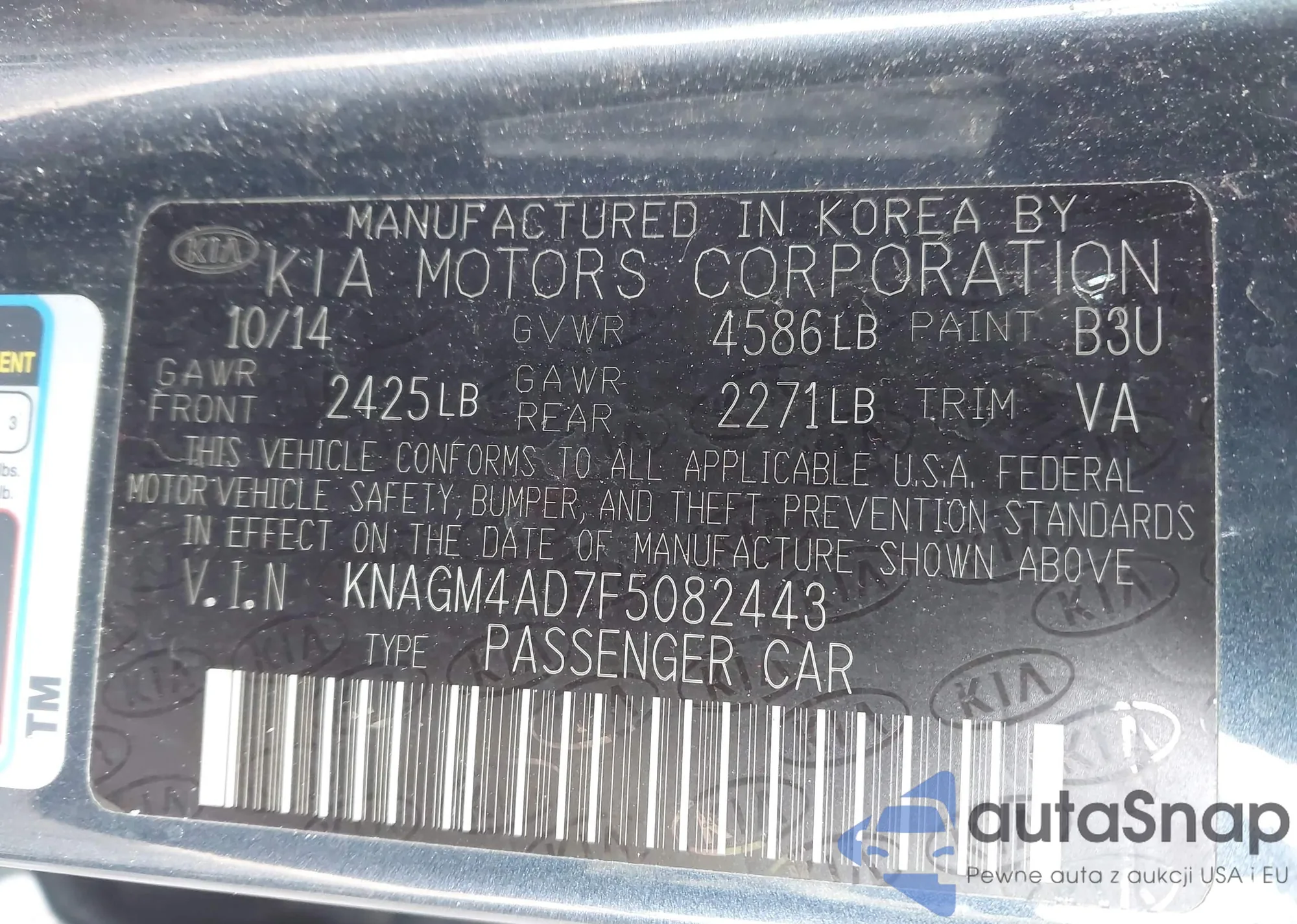 LOT: 42696050 VIN: KNAGM4AD7F5082443