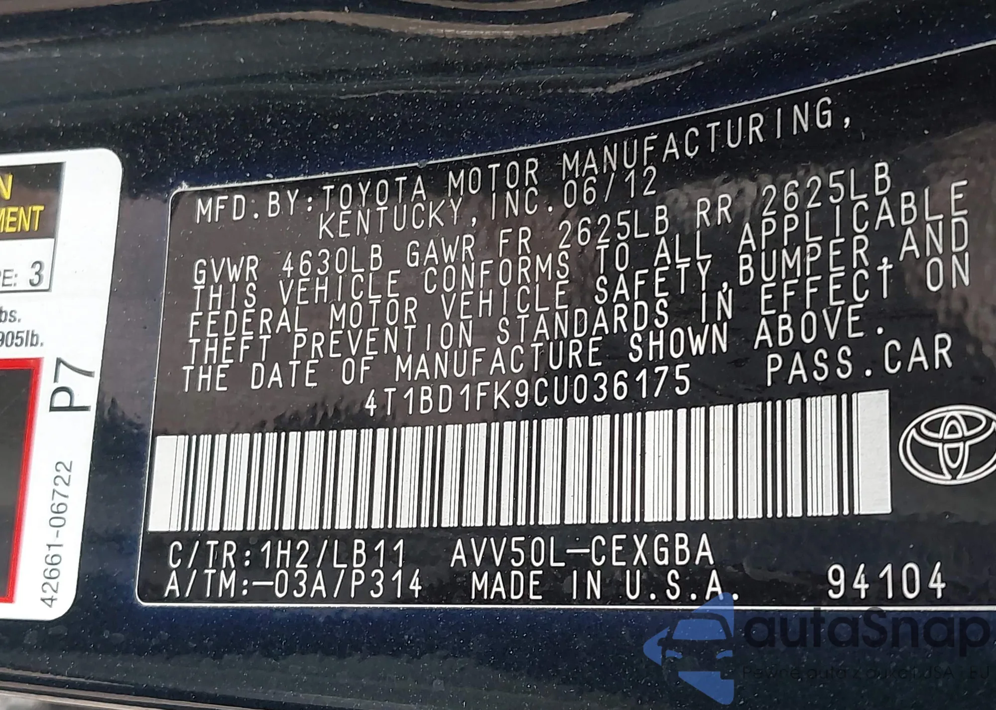 • VIN 4T1BD1FK9CU036175