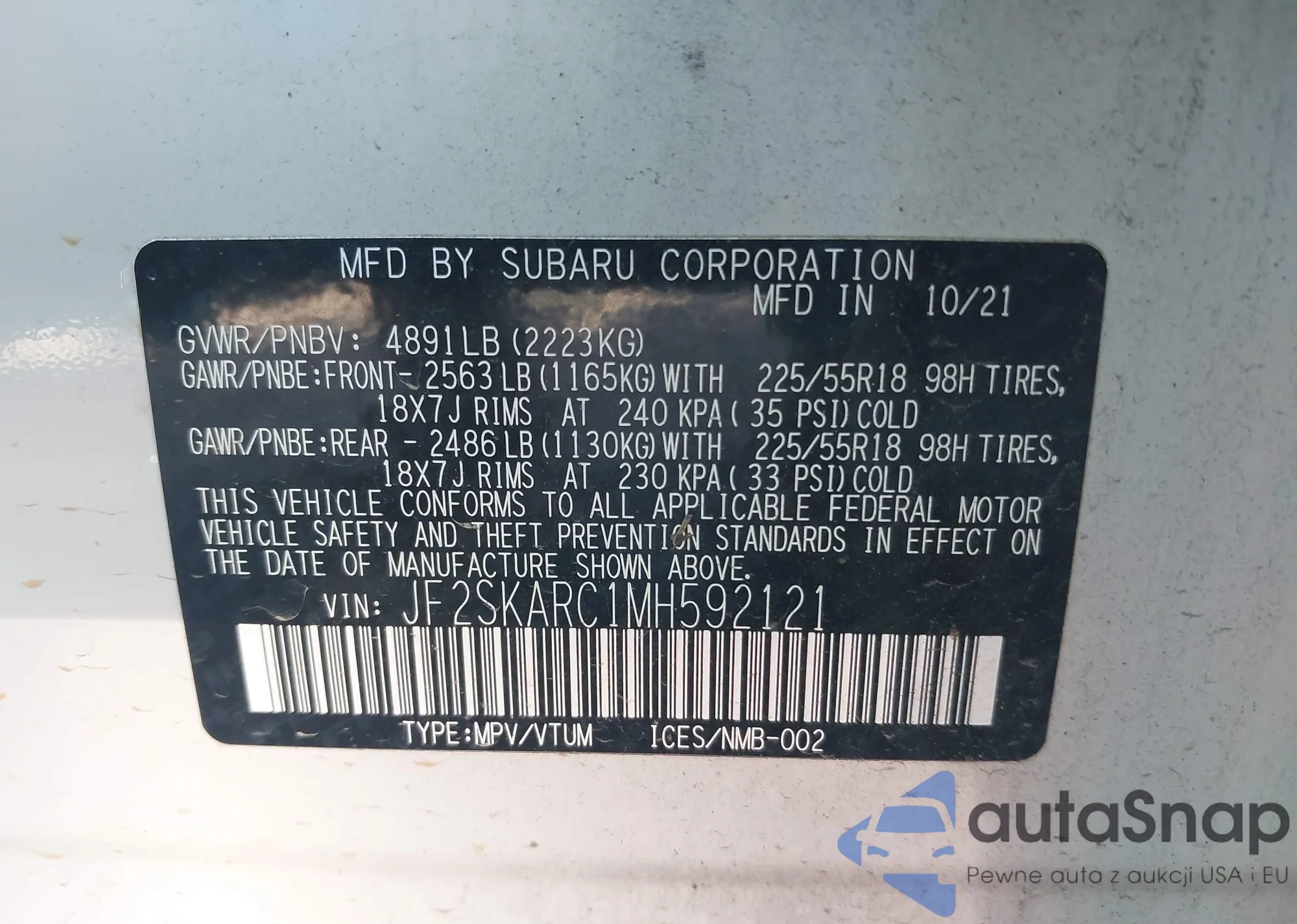LOT: 43123153 VIN: JF2SKARC1MH592121