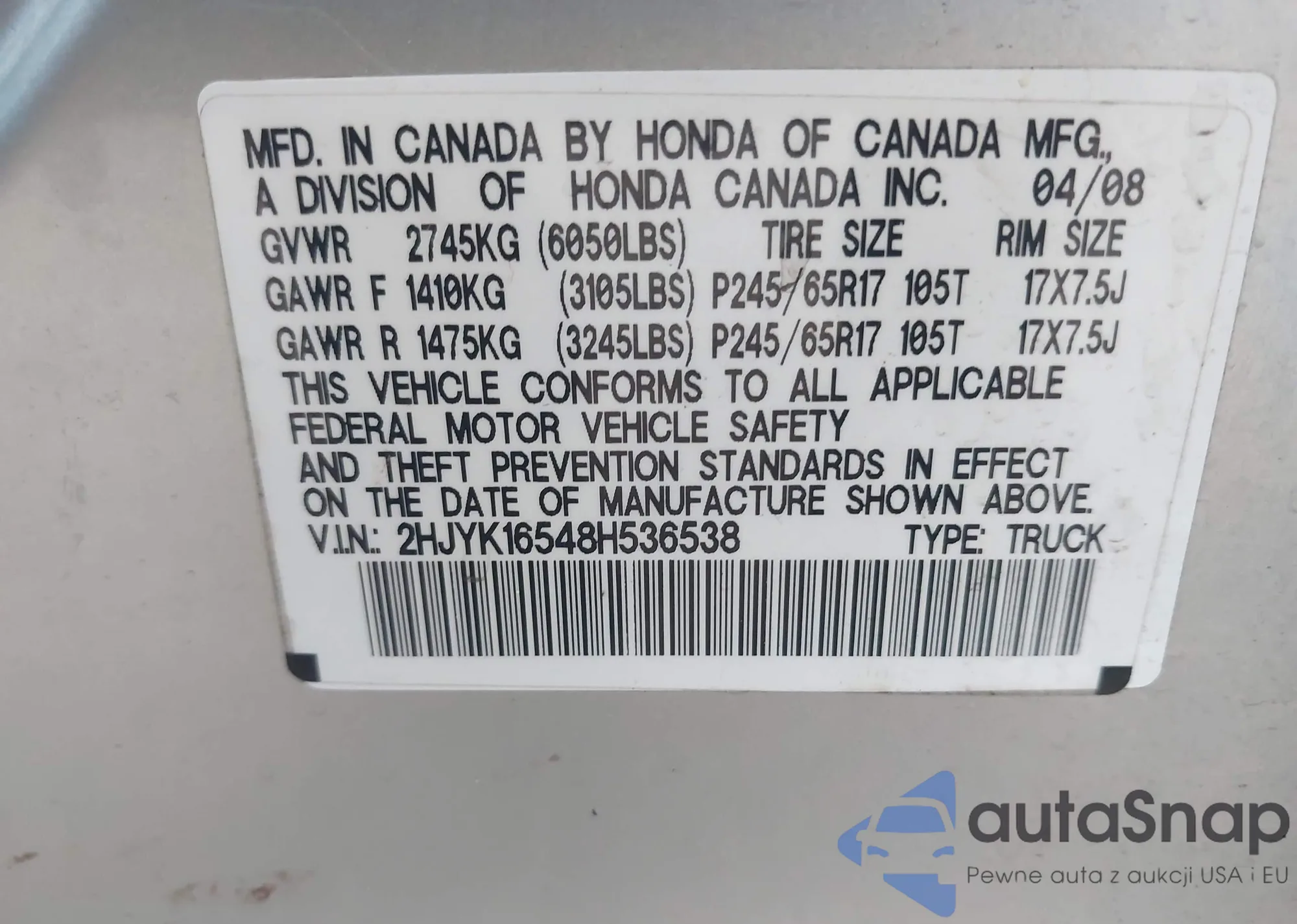 • VIN 2HJYK16548H536538