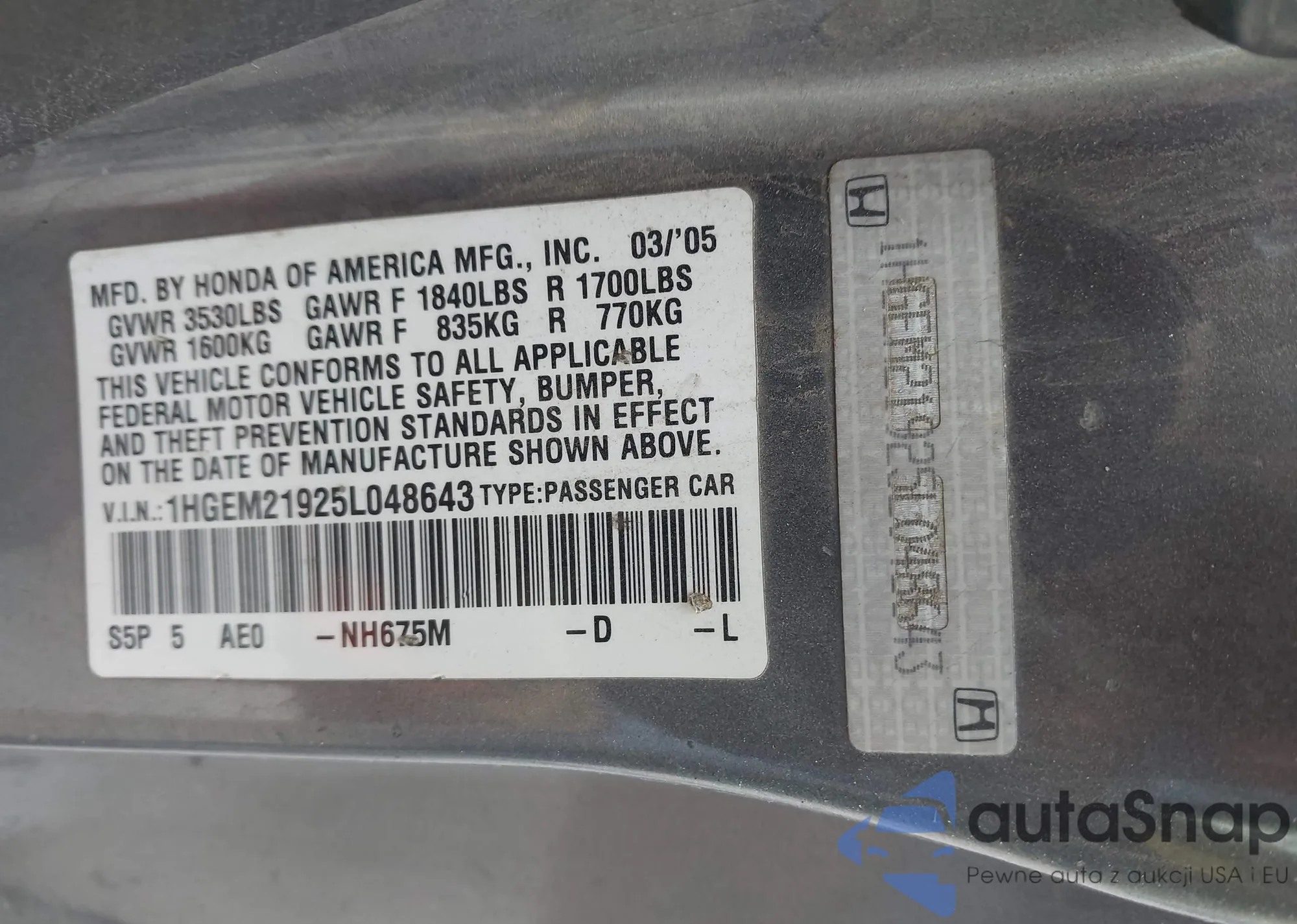 LOT: 43209392 VIN: 1HGEM21925L048643