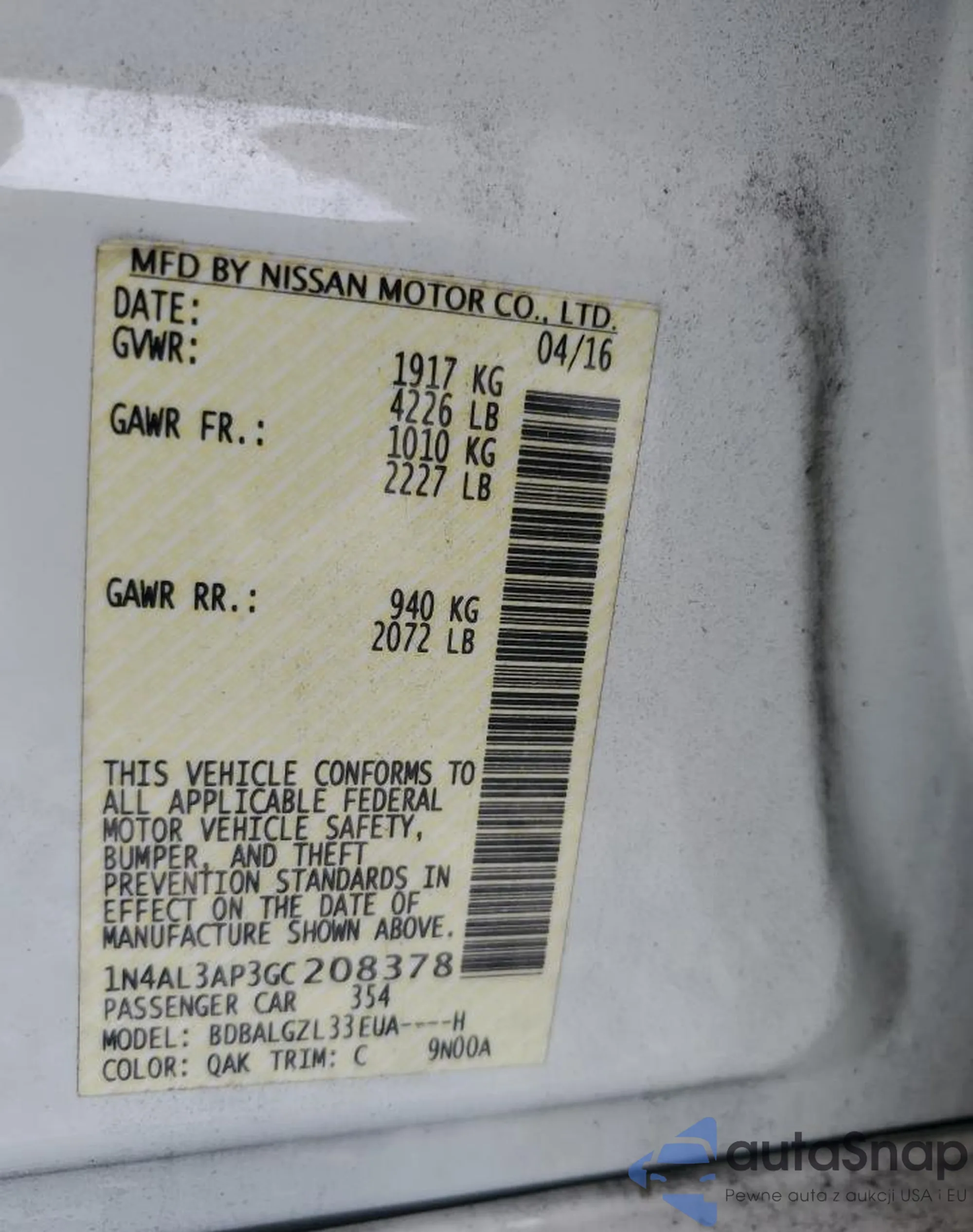 LOT: 67715995 VIN: 1N4AL3AP3GC208378