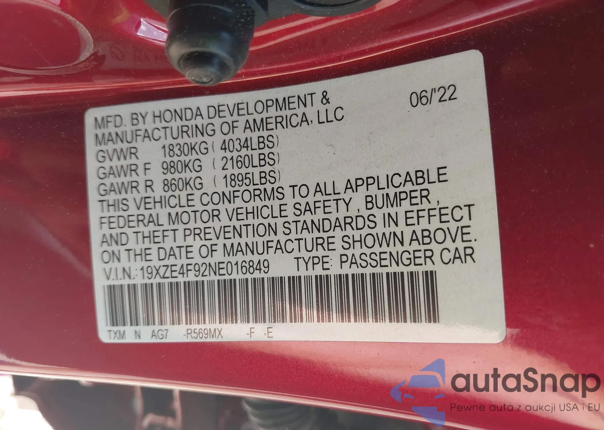LOT: 43016112 VIN: 19XZE4F92NE016849