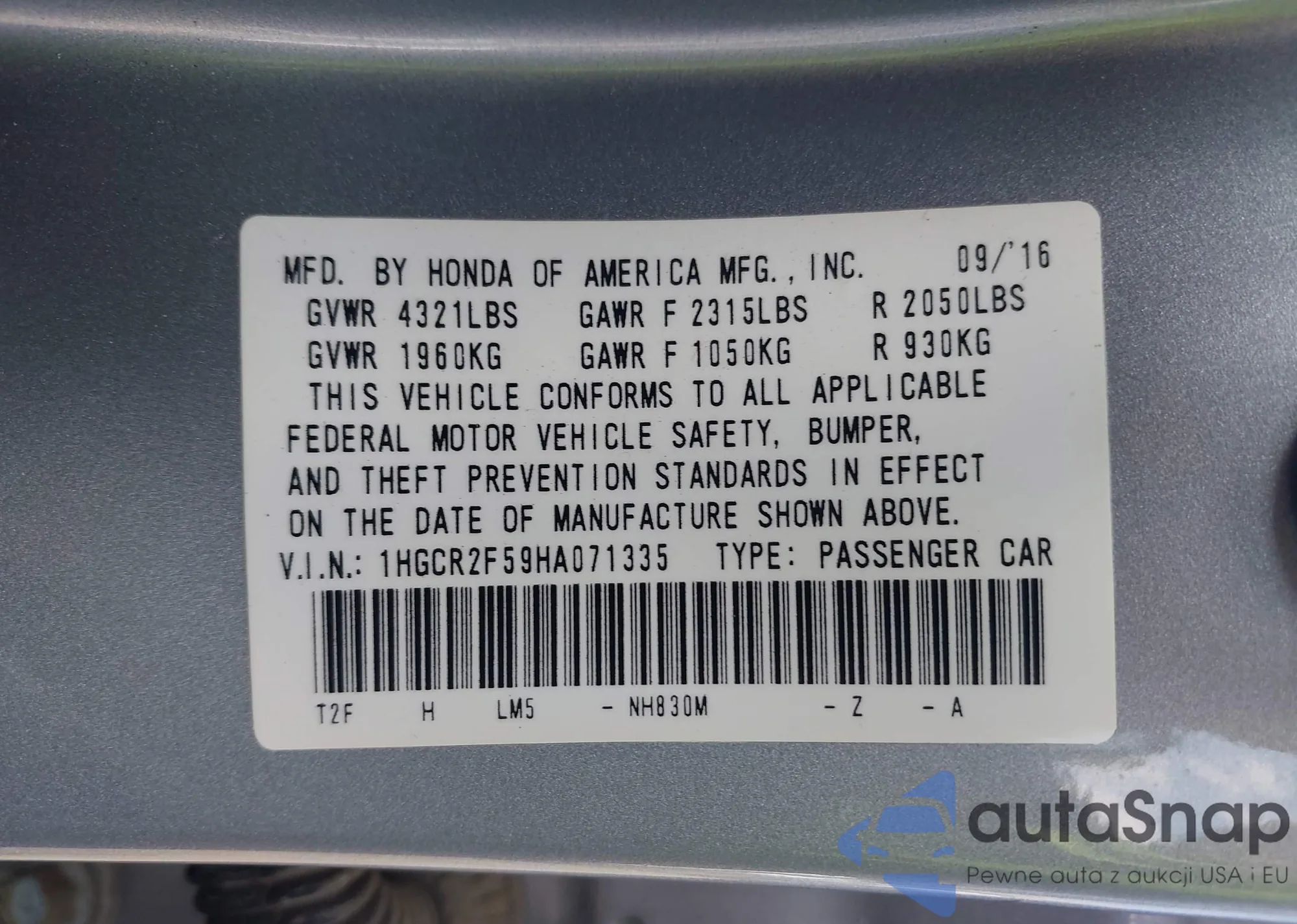 LOT: 43273098 VIN: 1HGCR2F59HA071335