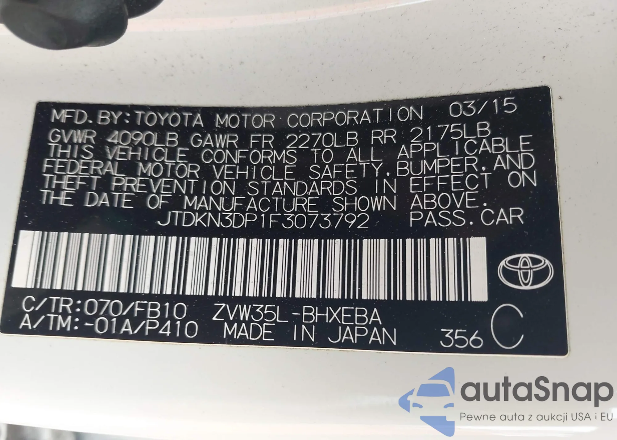 LOT: 42773312 VIN: JTDKN3DP1F3073792