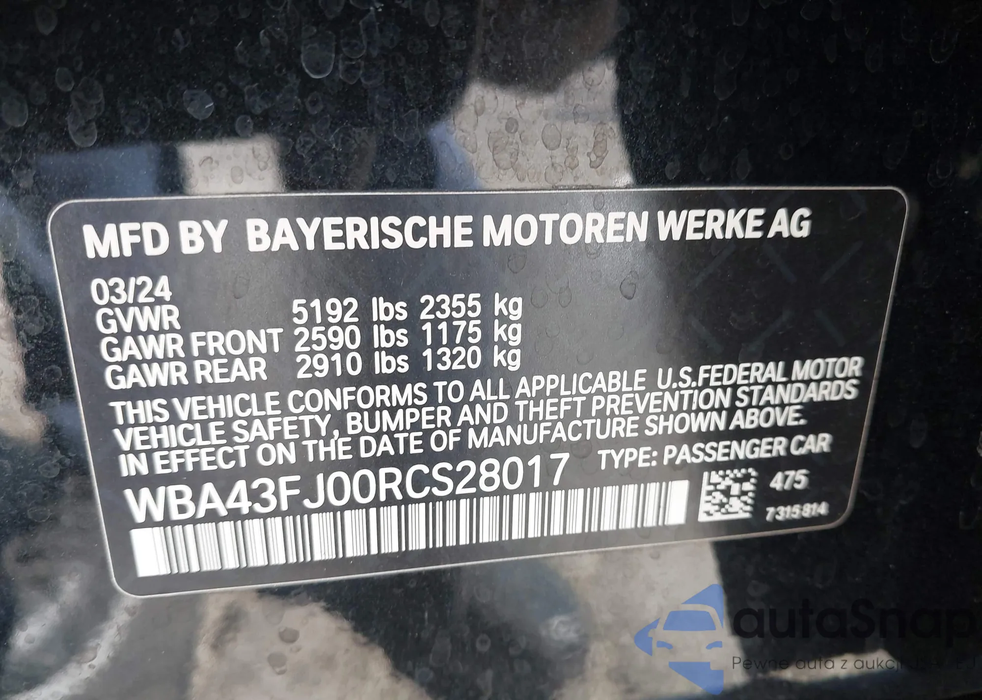 LOT: 42801926 VIN: WBA43FJ00RCS28017