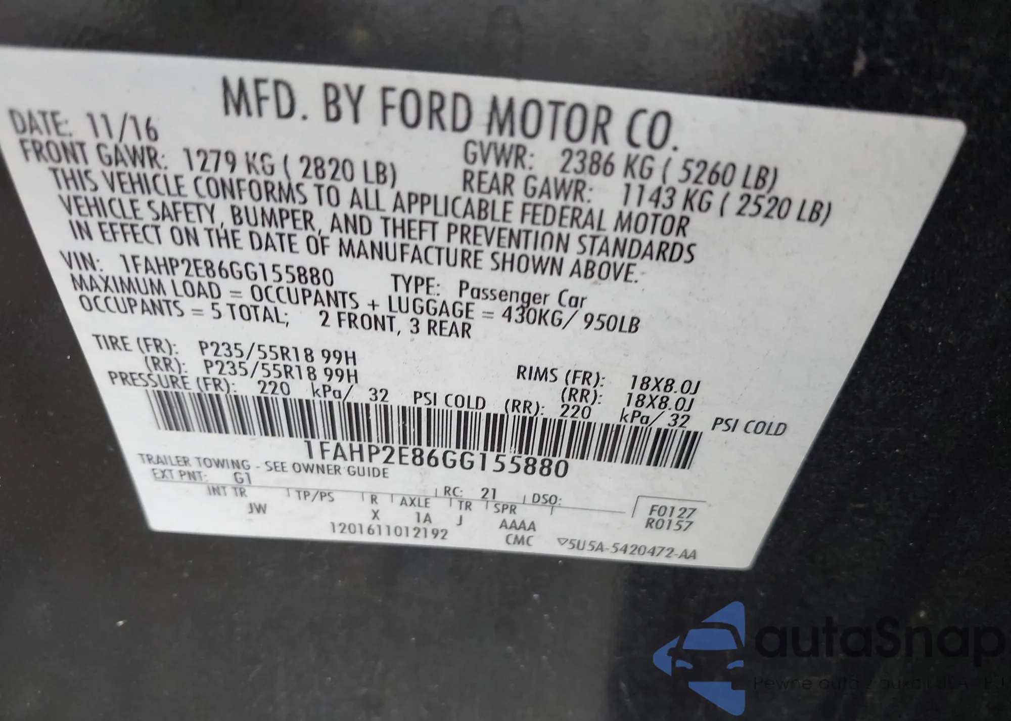 • VIN 1FAHP2E86GG155880