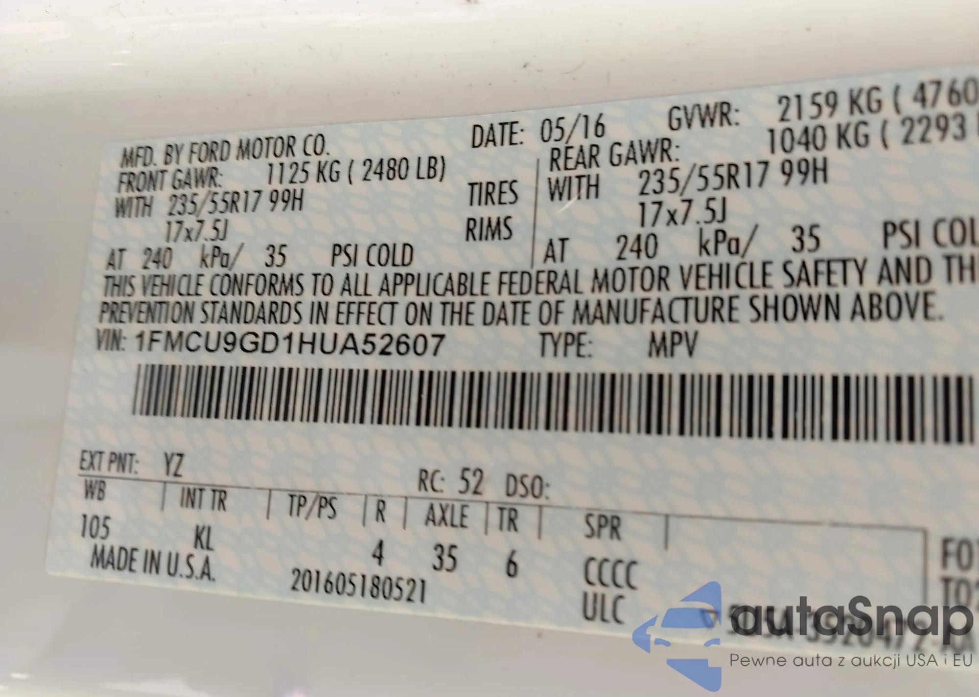 • VIN 1FMCU9GD1HUA52607