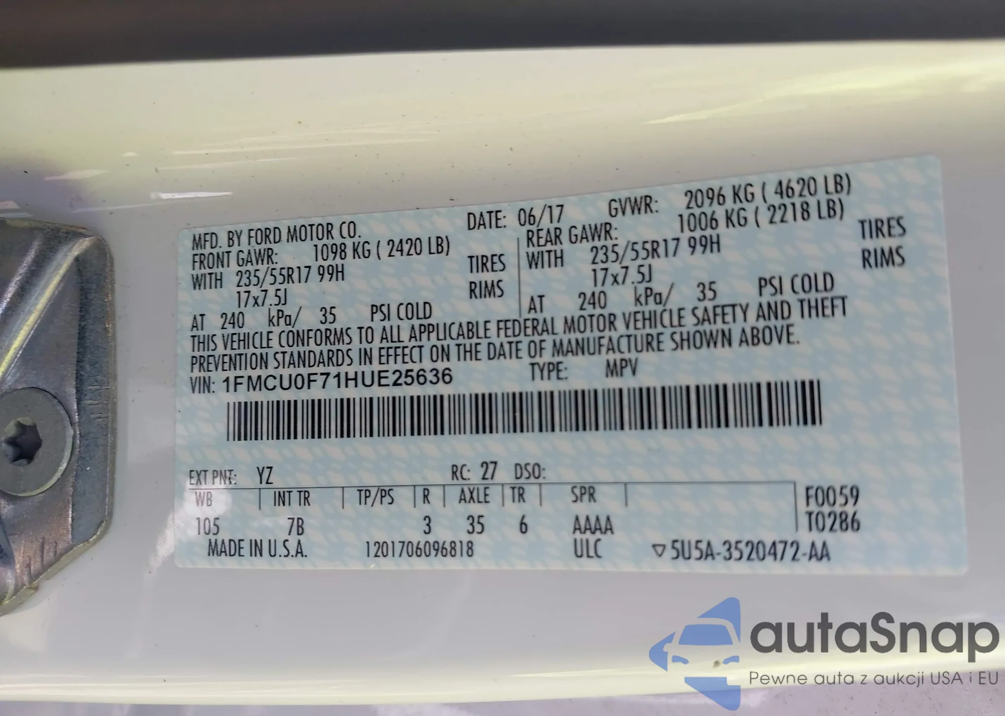 LOT: 43088180 VIN: 1FMCU0F71HUE25636