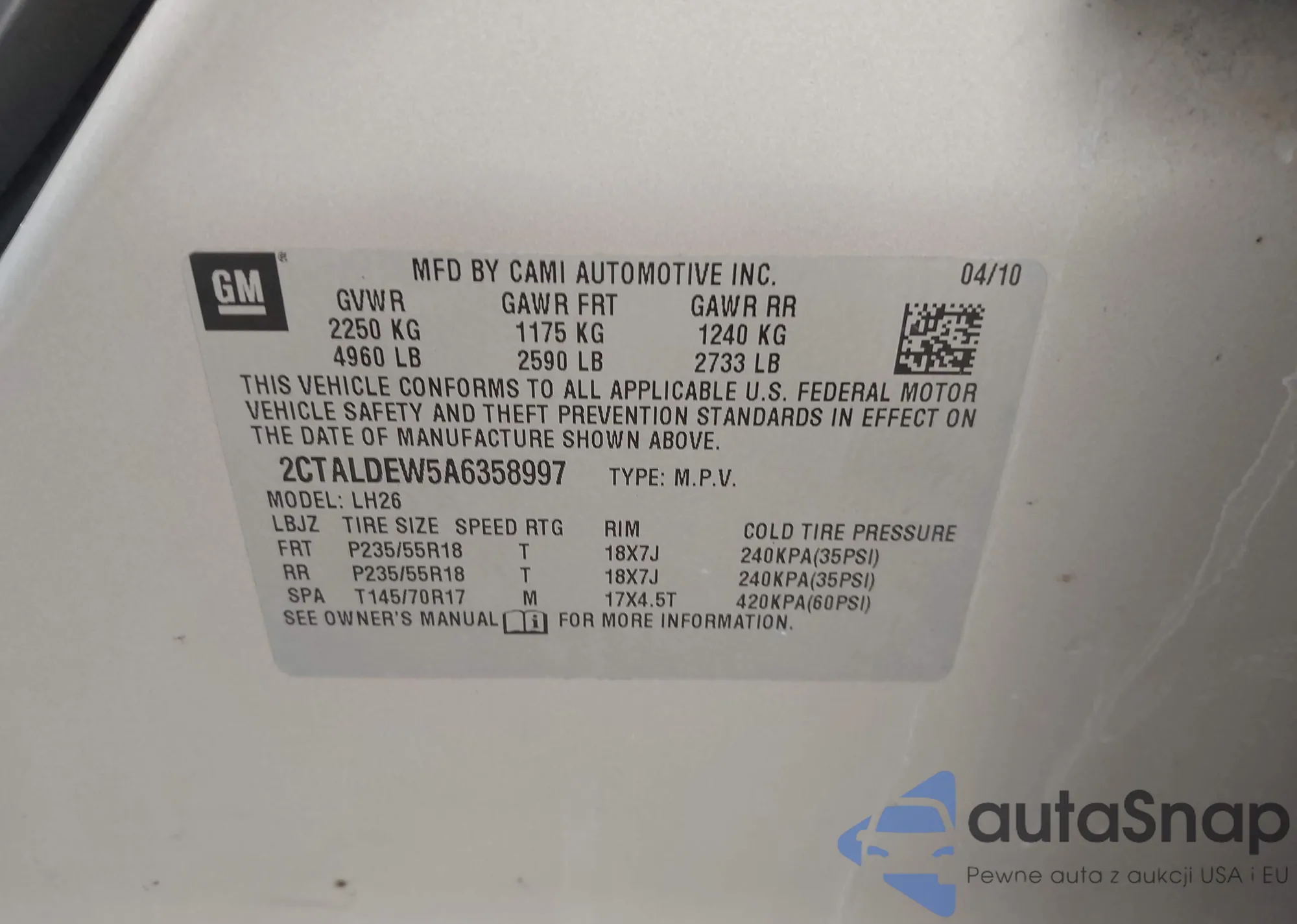 LOT: 42936670 VIN: 2CTALDEW5A6358997