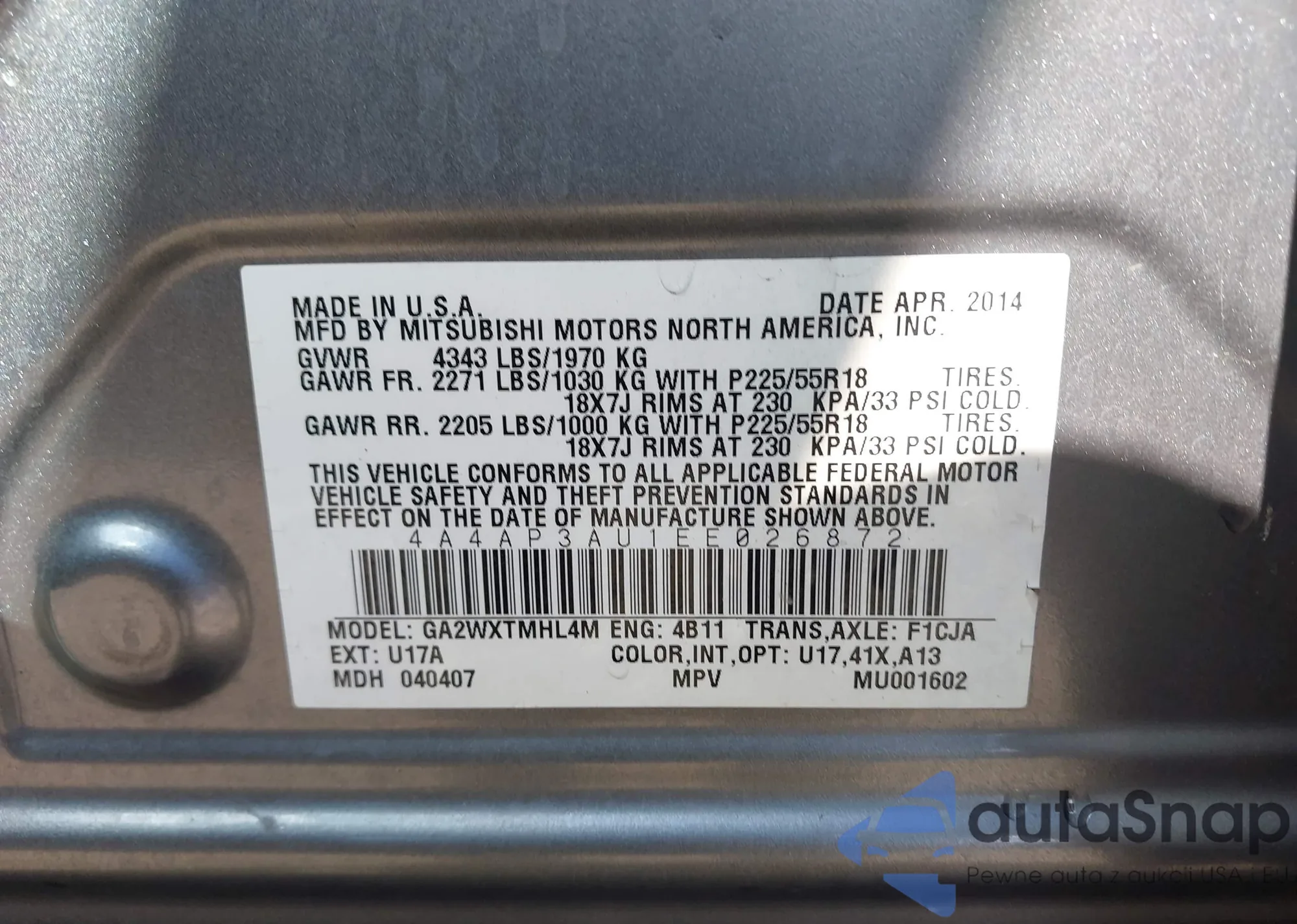 • VIN 4A4AP3AU1EE026872