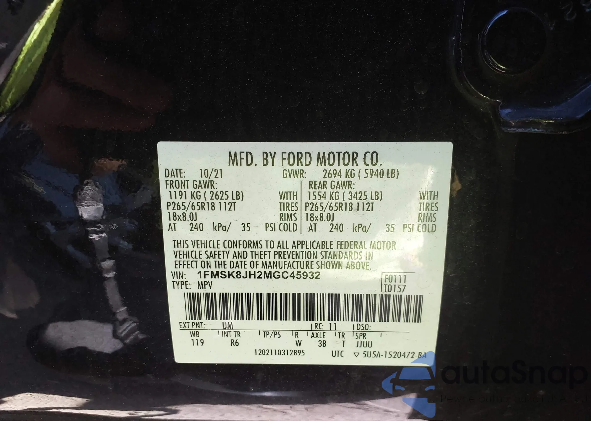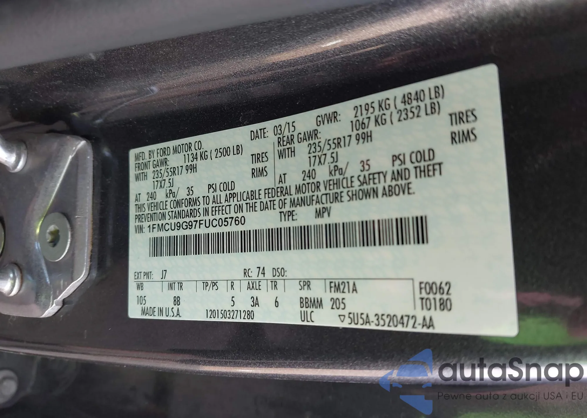 LOT: 43210160 VIN: 1FMCU9G97FUC05760