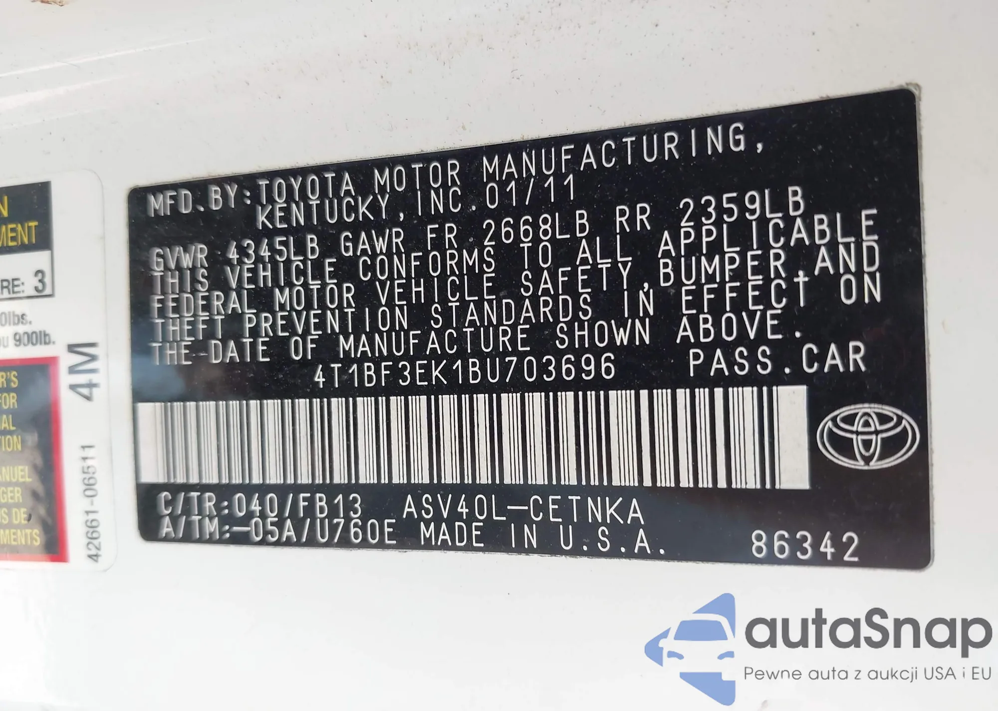 LOT: 42916850 VIN: 4T1BF3EK1BU703696