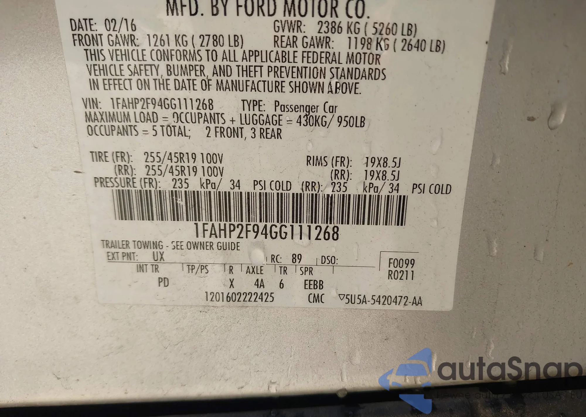 • VIN 1FAHP2F94GG111268