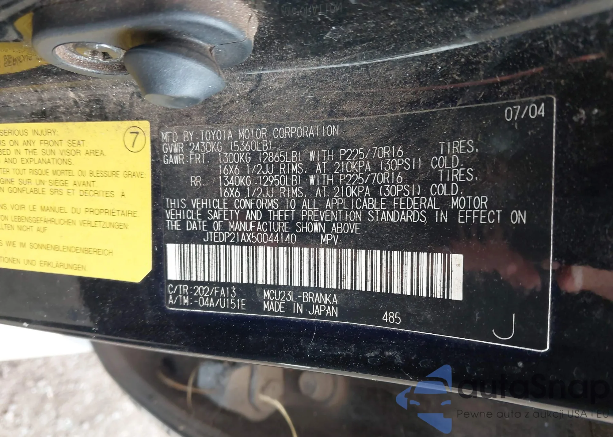 LOT: 40027637 VIN: JTEDP21AX50044140