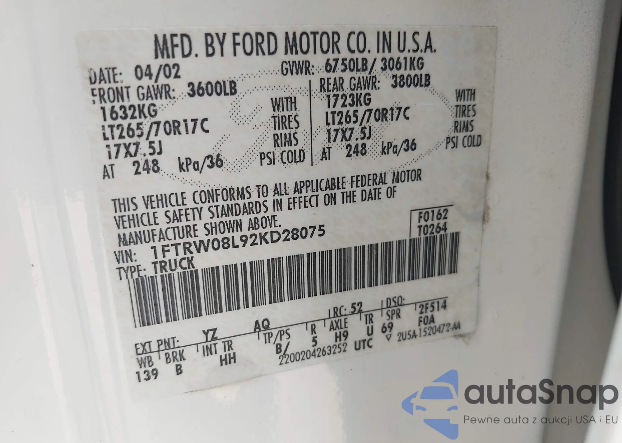 • VIN 1FTRW08L92KD28075