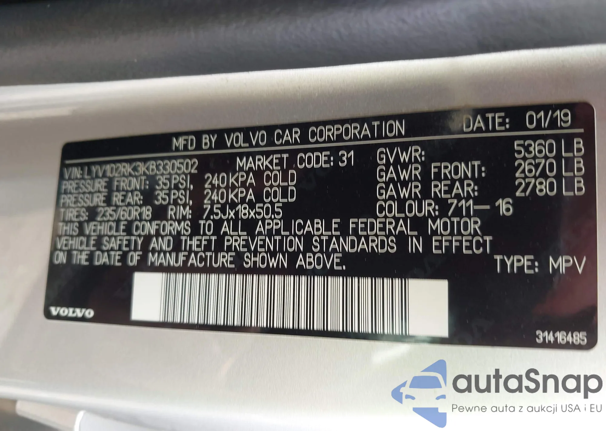 LOT: 43158518 VIN: LYV102RK3KB330502