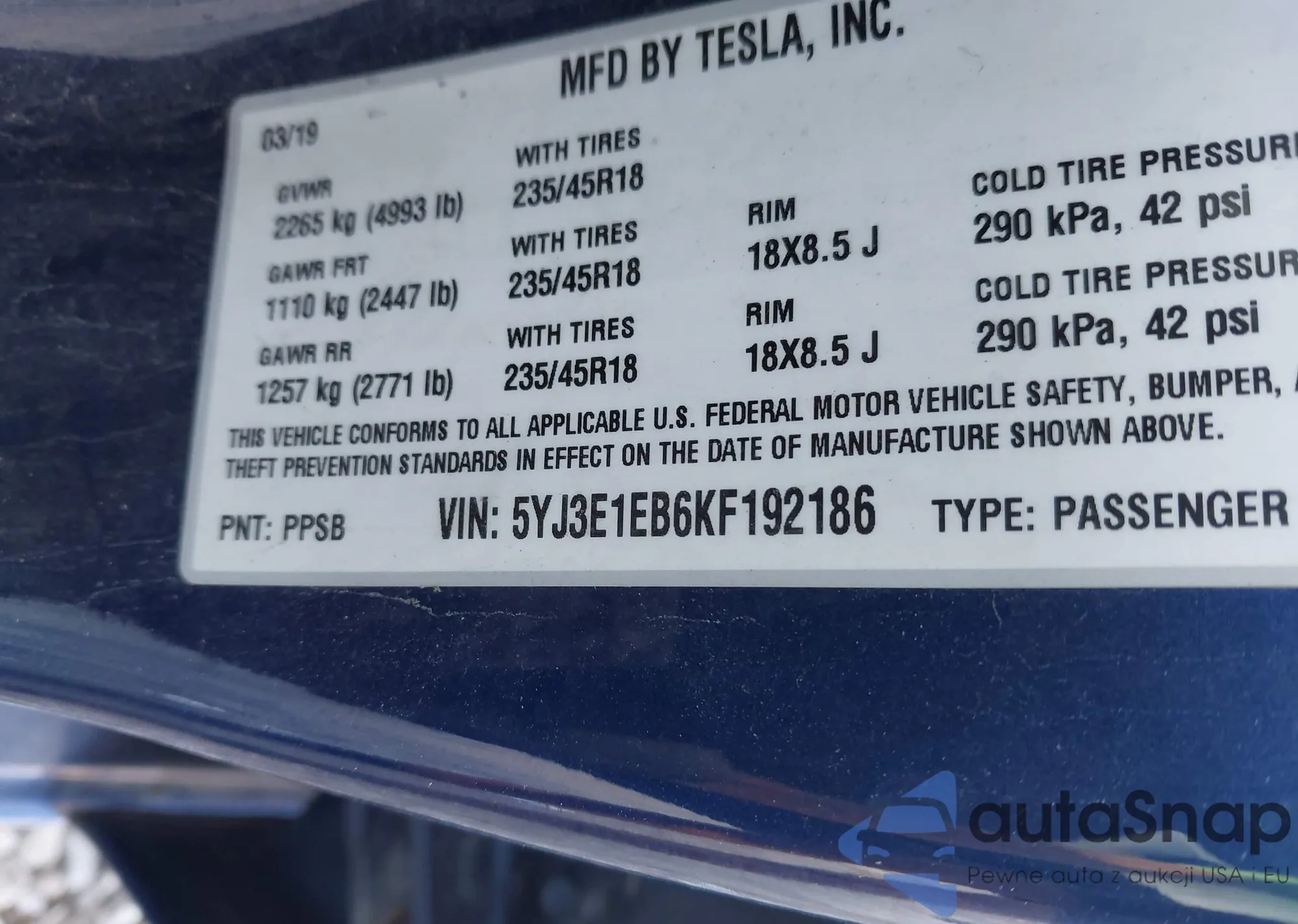 • VIN 5YJ3E1EB6KF192186