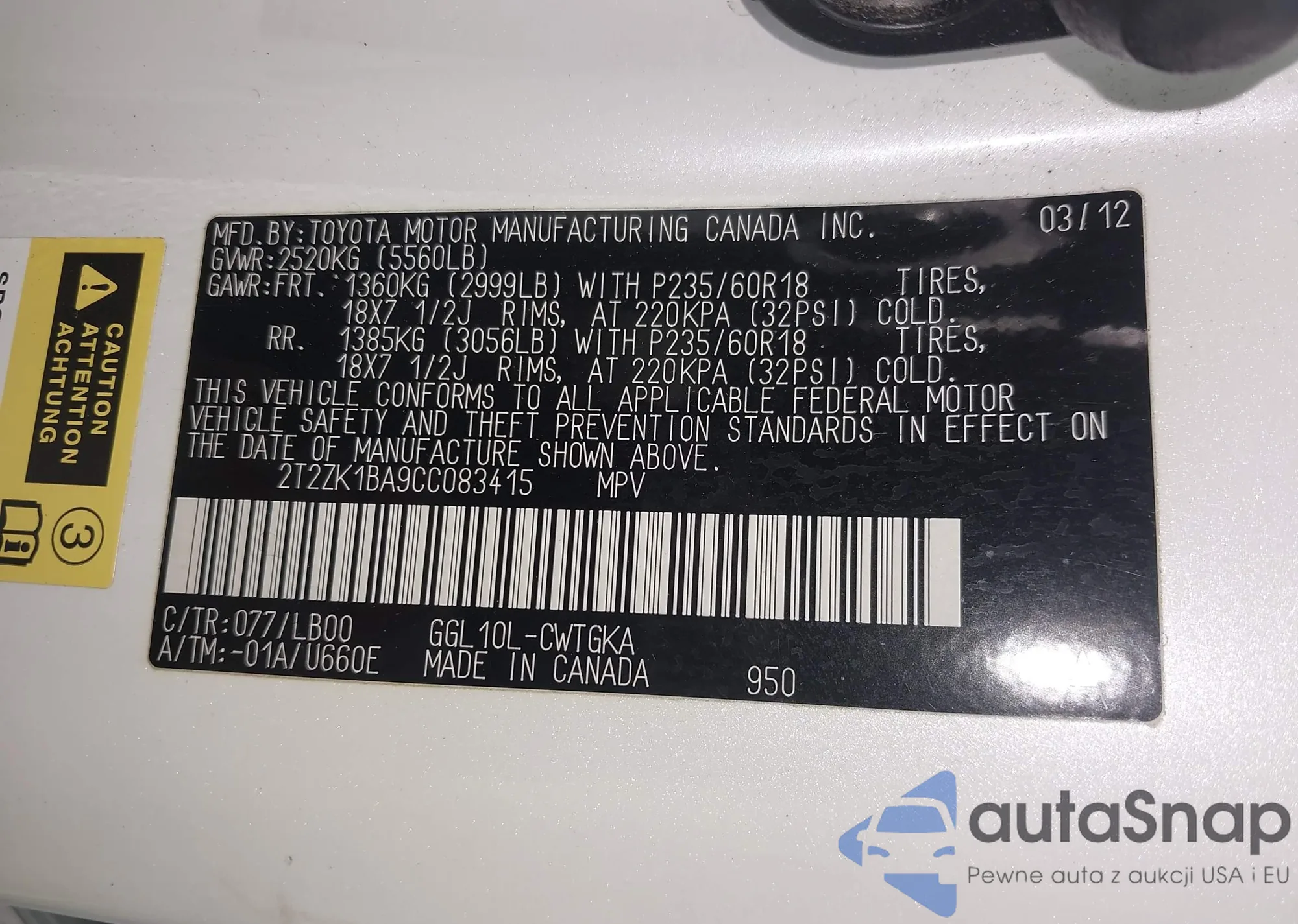 • VIN 2T2ZK1BA9CC083415