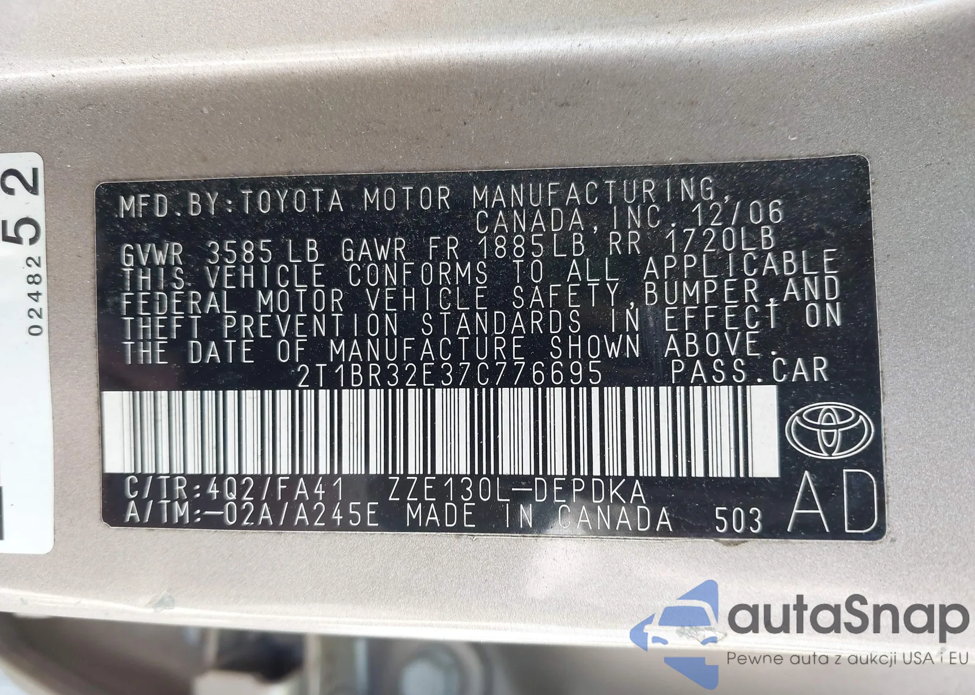 2007 Toyota Corolla Ce z USA, uszkodzony, nr VIN 2T1BR32E37C776695