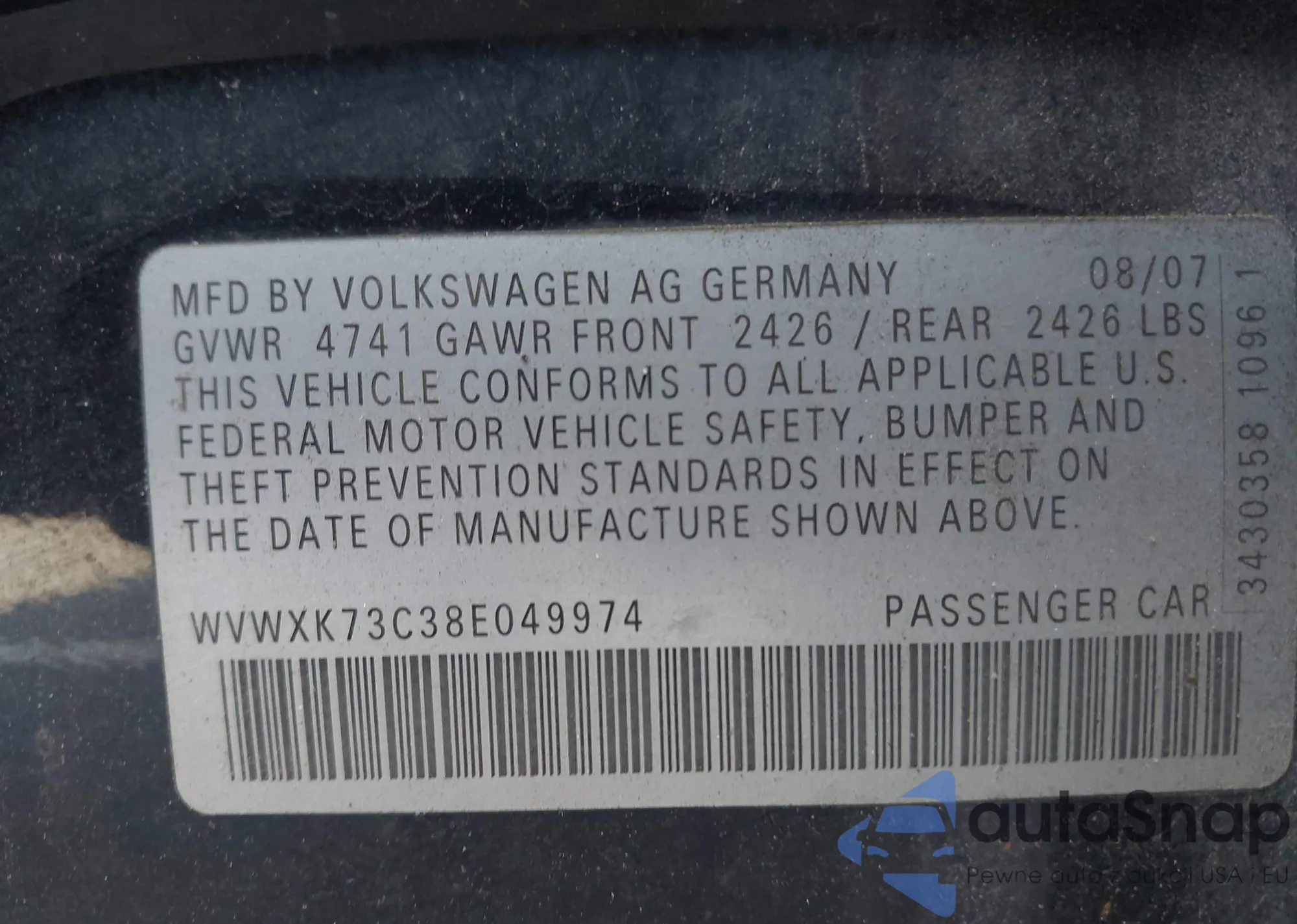 • VIN WVWXK73C38E049974