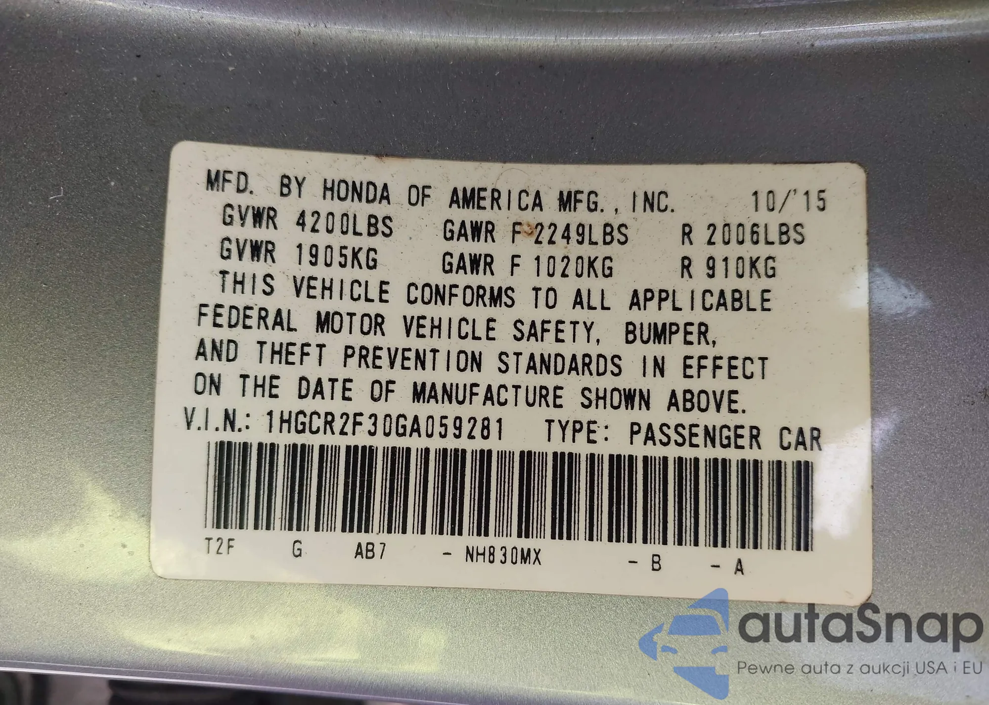 LOT: 43097650 VIN: 1HGCR2F30GA059281