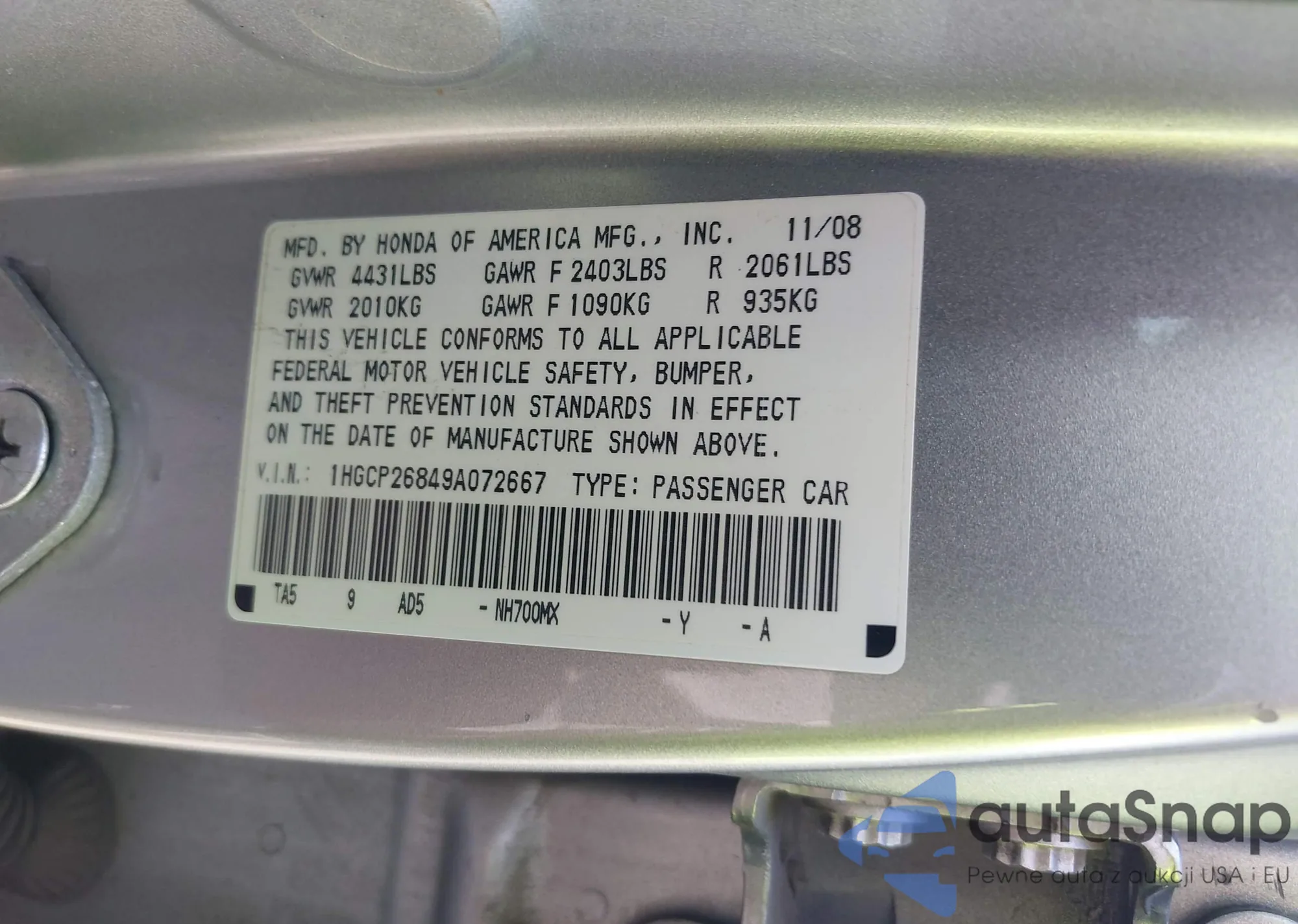 LOT: 43081464 VIN: 1HGCP26849A072667