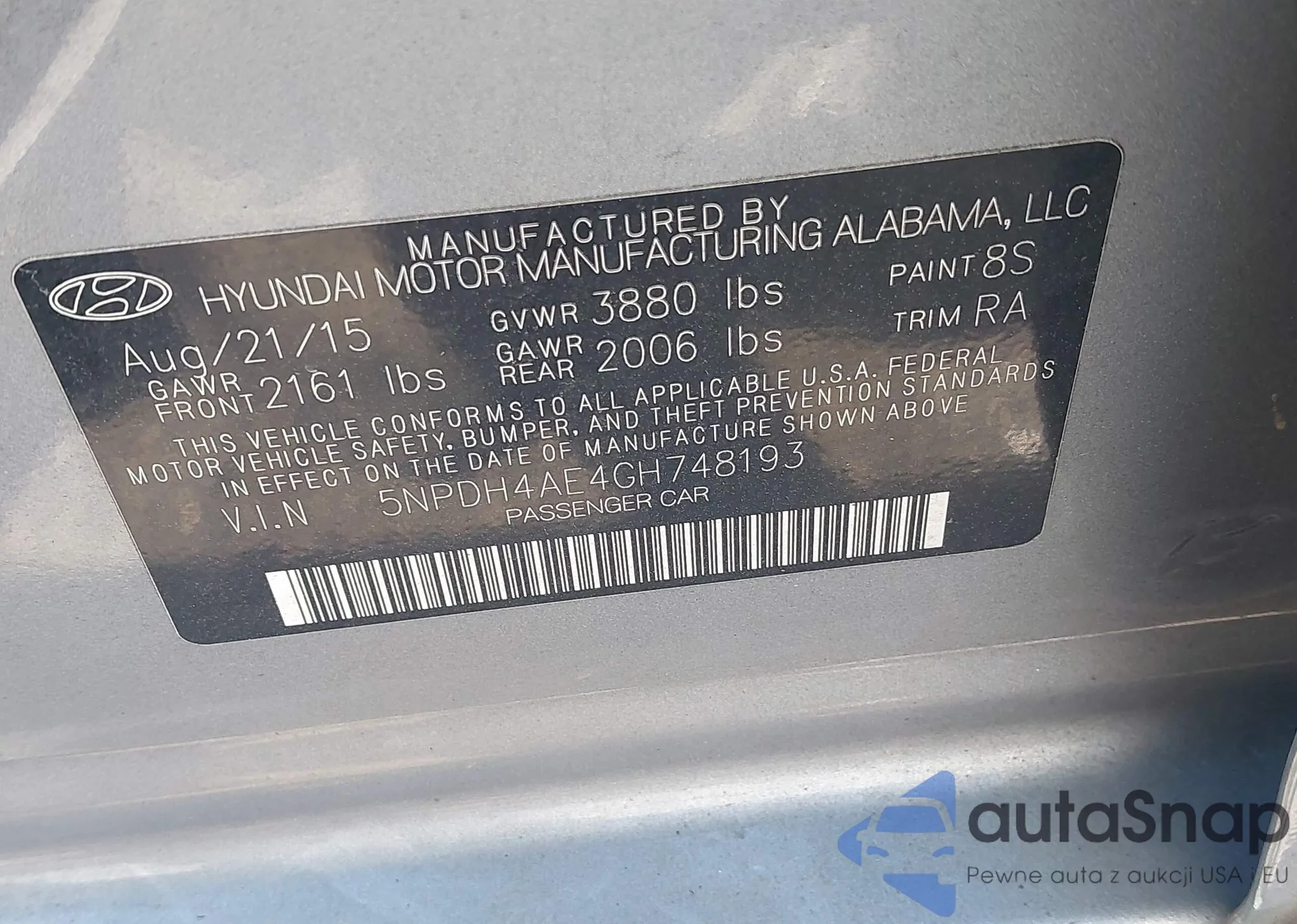 LOT: 43098536 VIN: 5NPDH4AE4GH748193