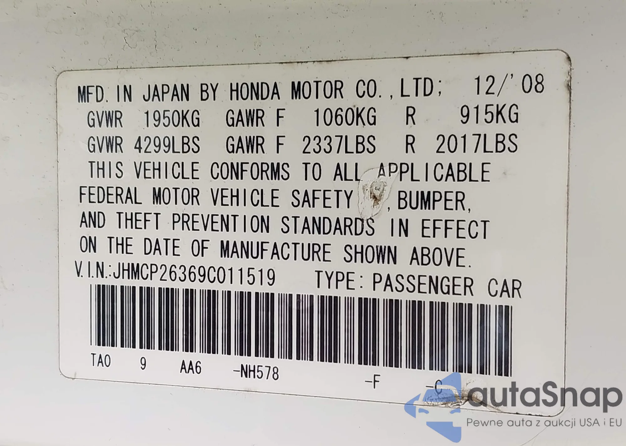 LOT: 43103506 VIN: JHMCP26369C011519