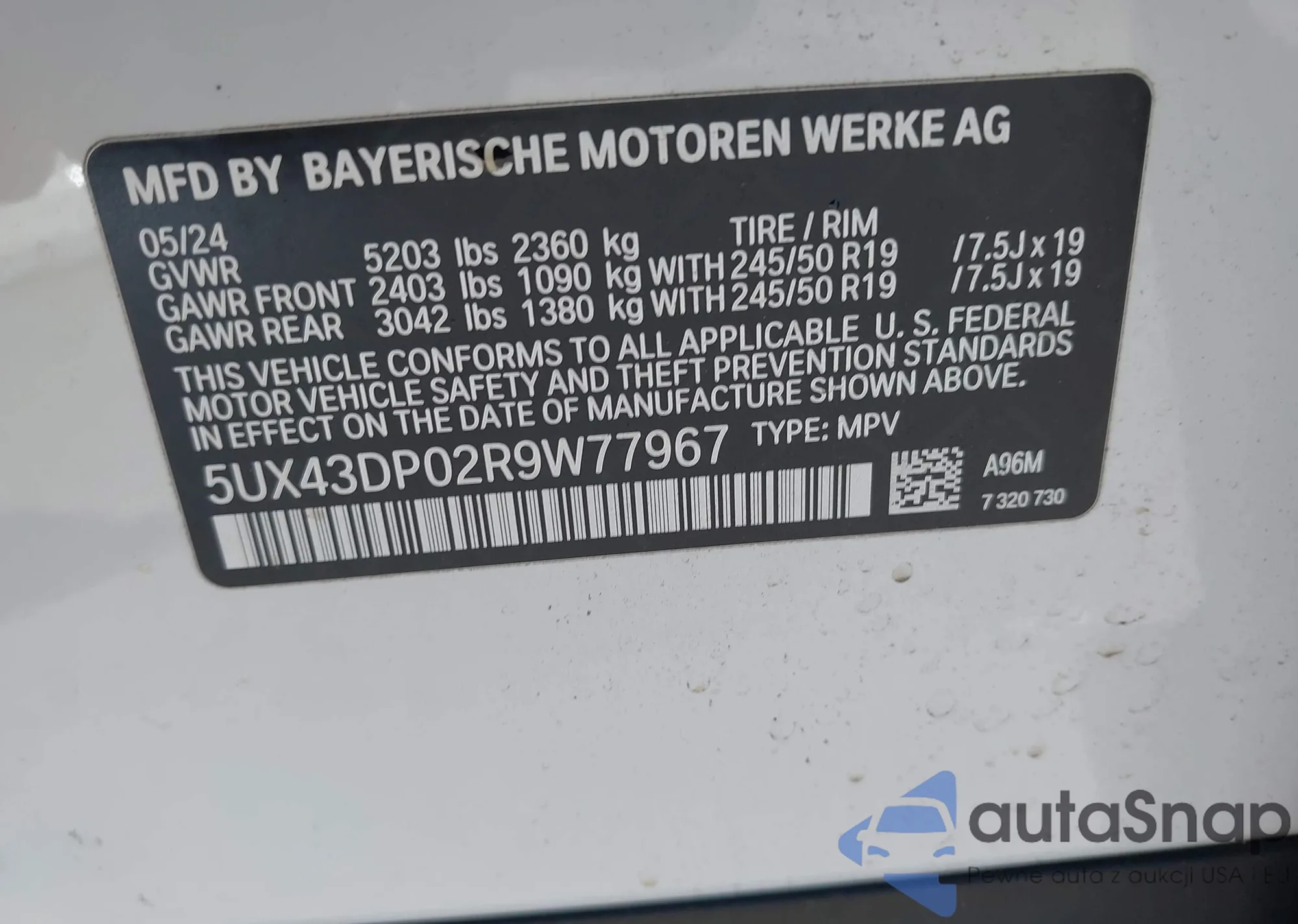 LOT: 43118737 VIN: 5UX43DP02R9W77967