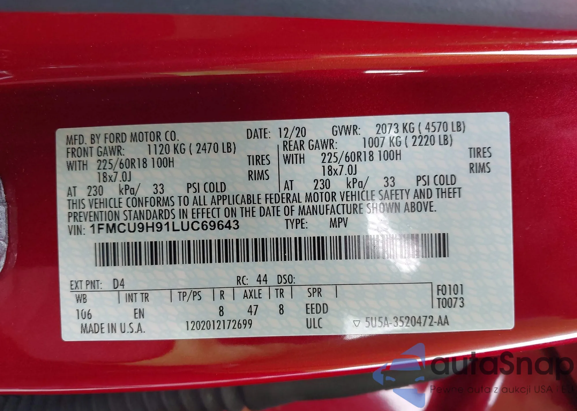 LOT: 43102362 VIN: 1FMCU9H91LUC69643