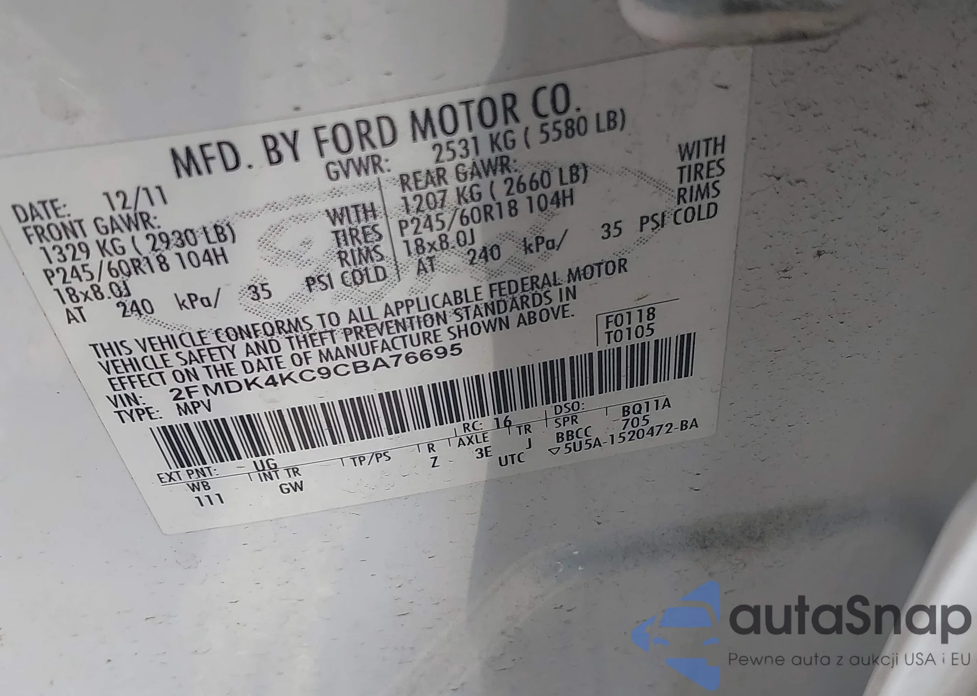 LOT: 43120009 VIN: 2FMDK4KC9CBA76695