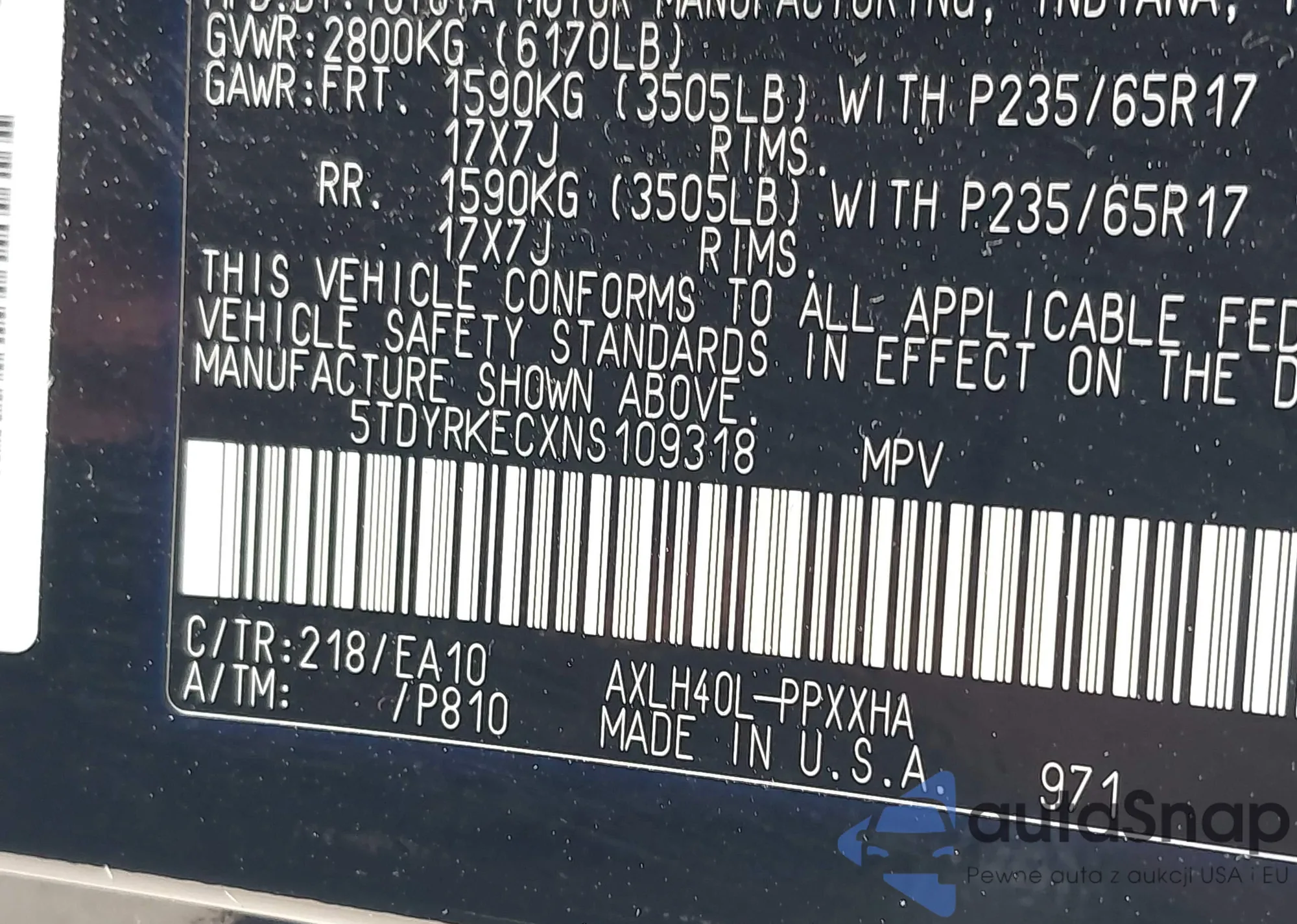 LOT: 42415200 VIN: 5TDYRKECXNS109318